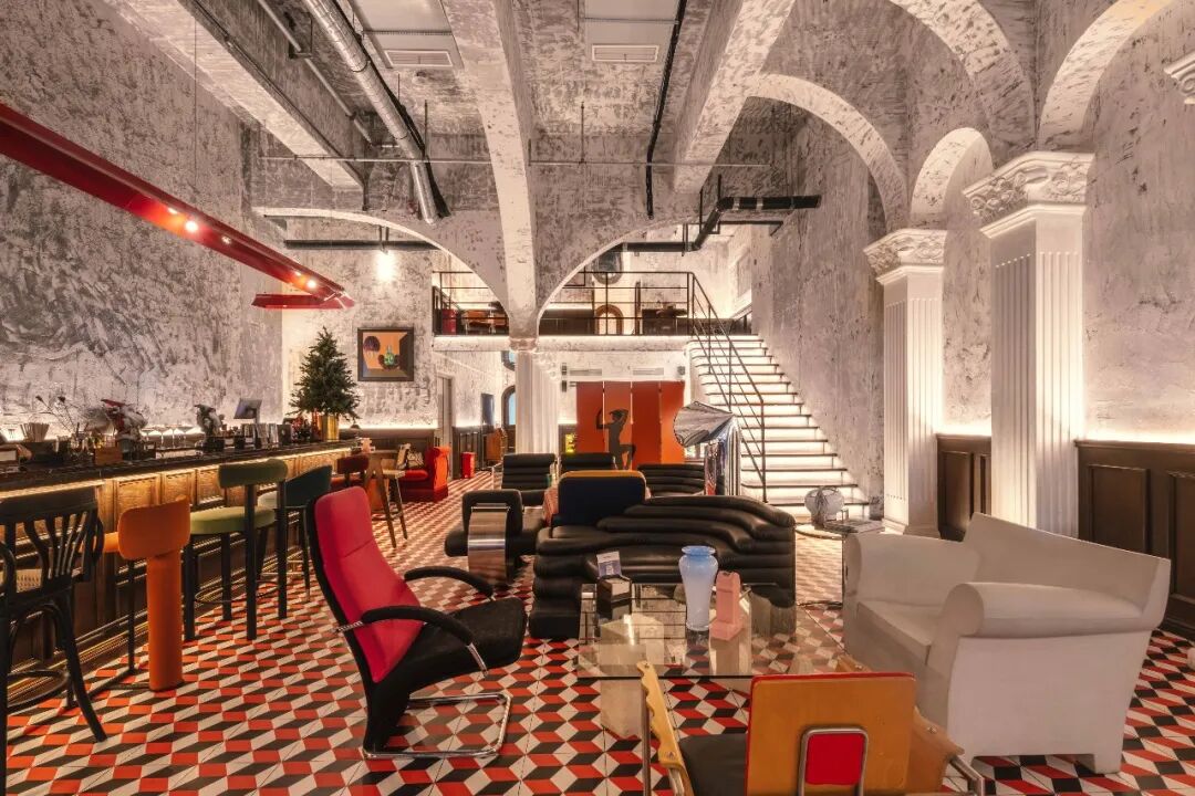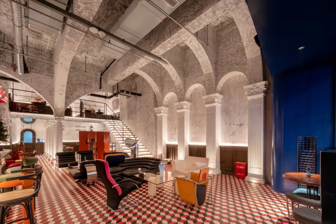 颜色确实是ASPIRYNA高新创合中心店的一大亮点,从旋转门走入空间内部,几乎会有种眼花缭乱的感觉,拼色地砖、原木色吧台、灰白色墙面与立柱,还有各色形态的Vintage家具,看似杂乱的颜色与布局却在空间中达成了某种视觉上的统一性。