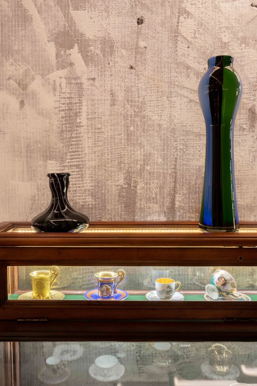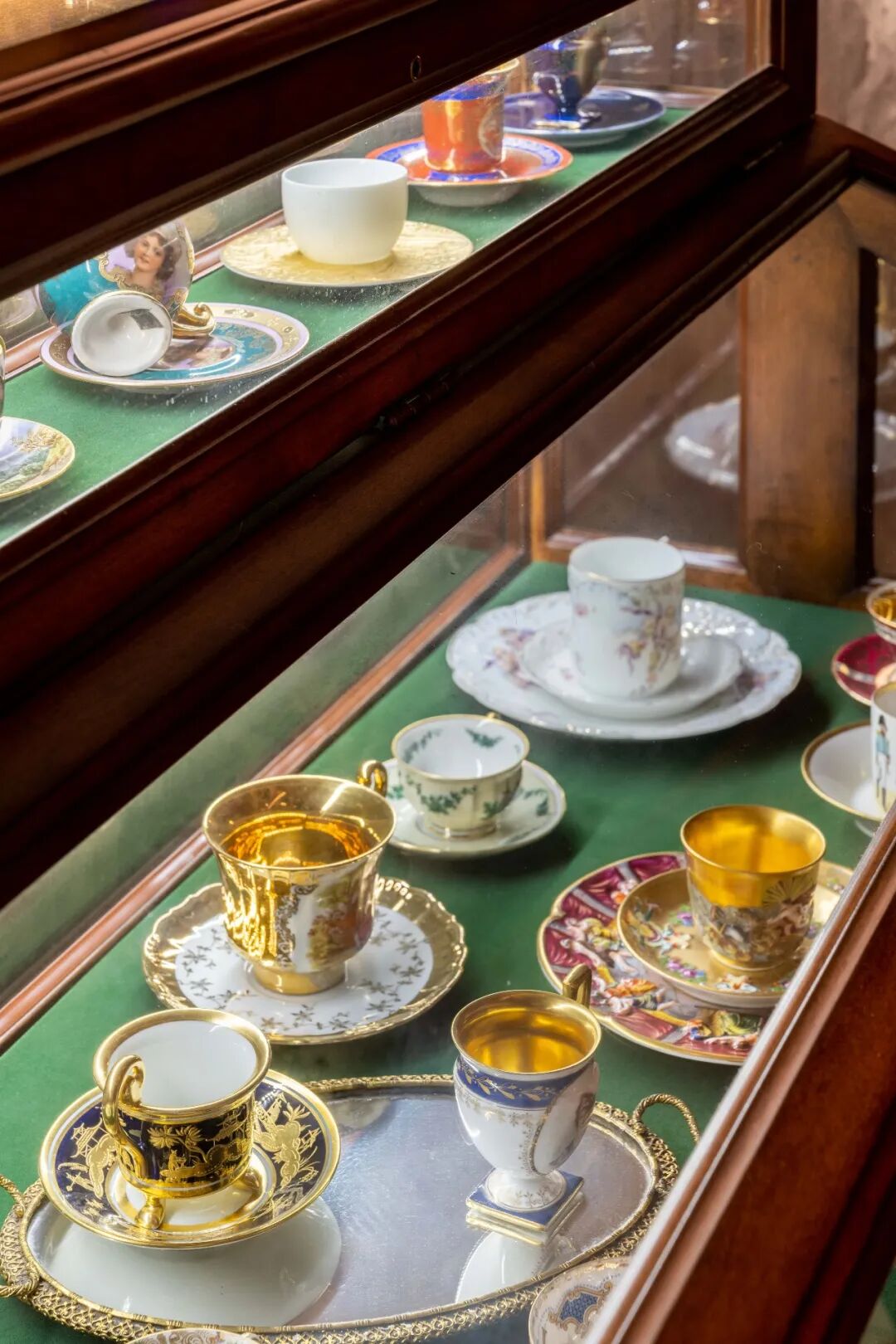 店内摆放的家具都是周周从欧洲各地淘来的,可以对外售卖,一楼展柜则摆放着她自己收藏的古董茶具,仅供观赏拍照使用。