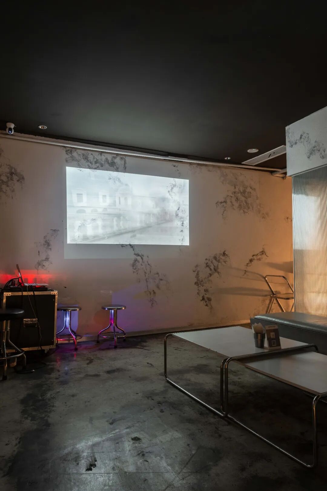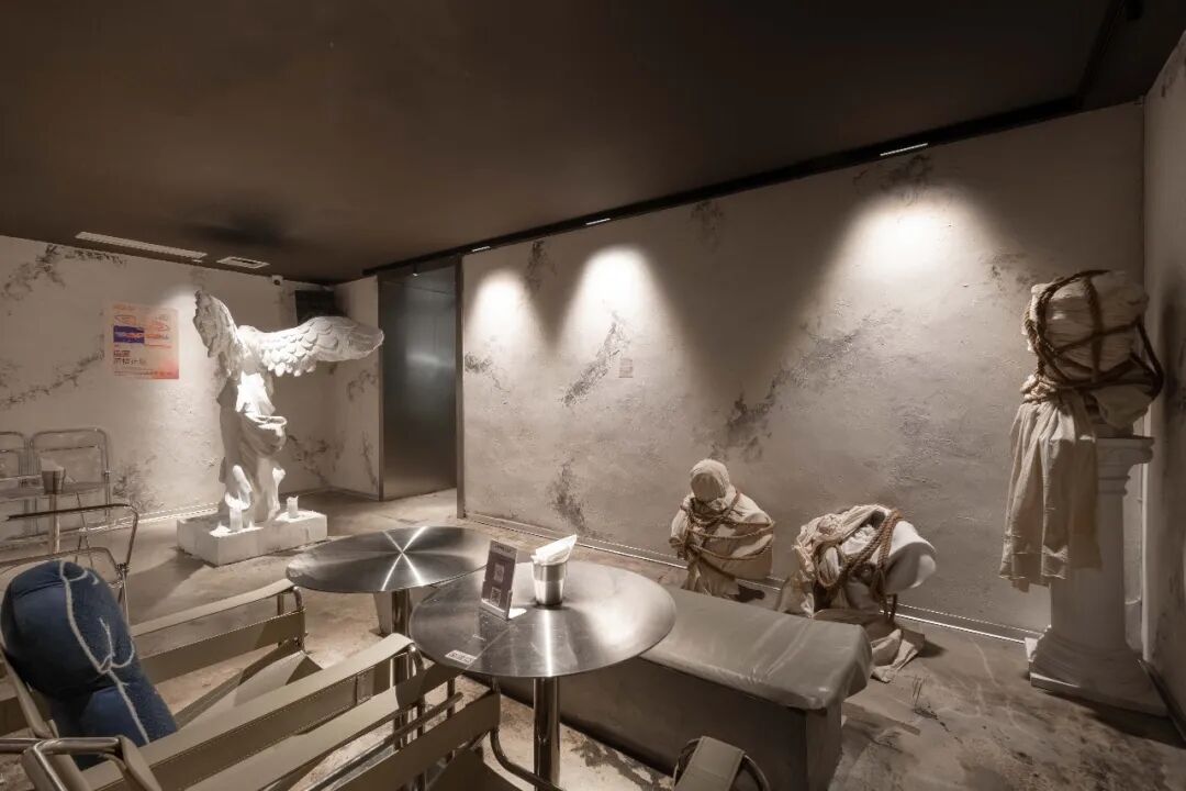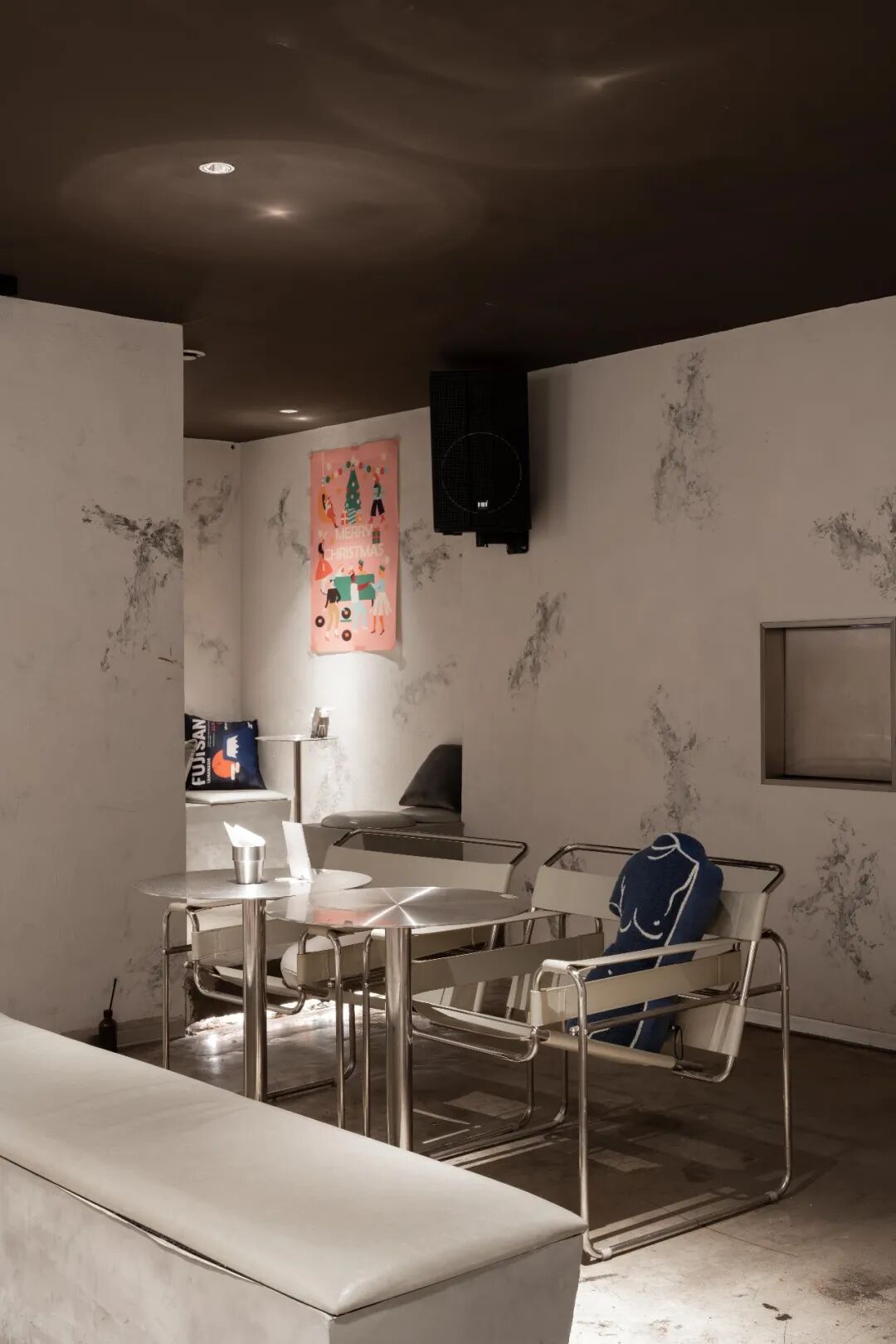 大面积不锈钢材质的运用和银白色的主色调使得空间整体呈现出相当的冷硬感和未来感,墙面的涂料是周周自己画的,形态像是末日电影中天空的残云,或残缺、或被包裹束缚的雕塑被放置在空间中,更增添了一丝颓废感。