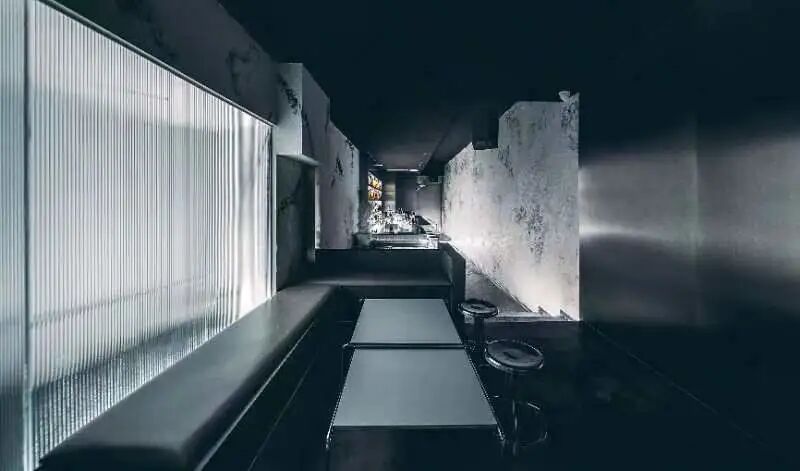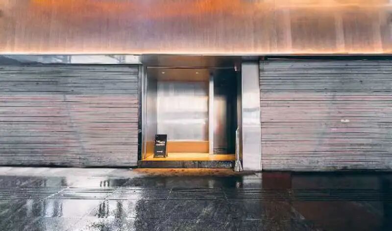 进入空间内部的方式也颇为复杂,绕过门头后会发现一扇巨大的不锈钢拉门,却无法手动开启,需要在店内的人提示下按下左手边的金属按钮,才能得以看见空间真正的样子。