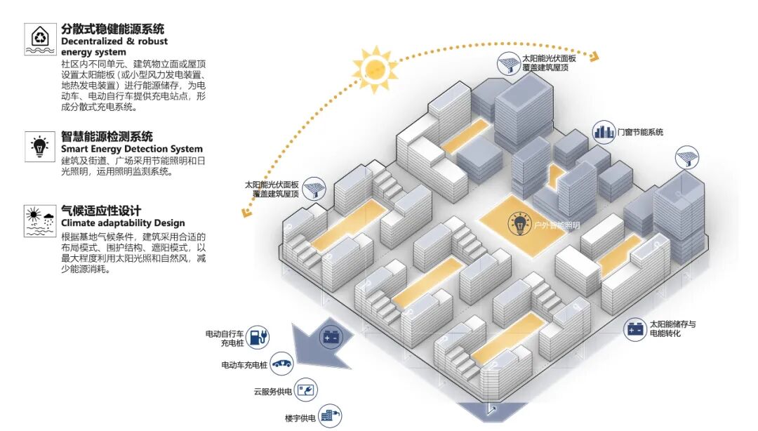 当前能源系统的脆弱性源于其主要依赖化石燃料,不可再生的资源在燃烧时释放出改变气候的温室气体。方案围绕打造空间在这方面的适应性上同样有着系统性的操作,我们充分发挥了场地内小街密路的建设思路,基于混合集约的土地利用机制构建了慢行导向的交通系统,尤其在单元层级上降低机动车依赖导致的碳排放。与此同时,方案考虑借助规划区域内的优势技术资源,帮助建立覆盖整个社区以及核心区的基于可再生能源的分散型能源网络,由此建立自足的能源供应系统,提升气候适应能力。