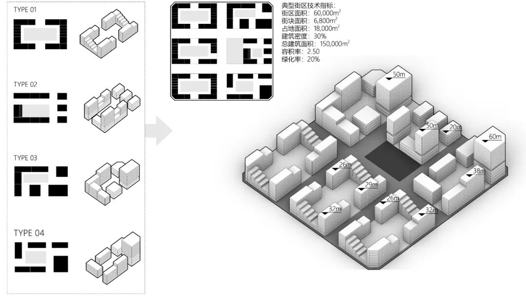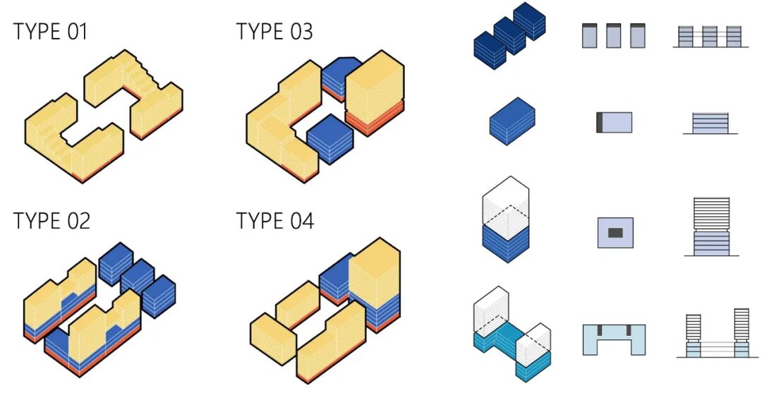 方案针对不同社群属性对居住呈现的差异化需求,结合恰当的空间密度提供了多种居住产品来提升社区的包容性。