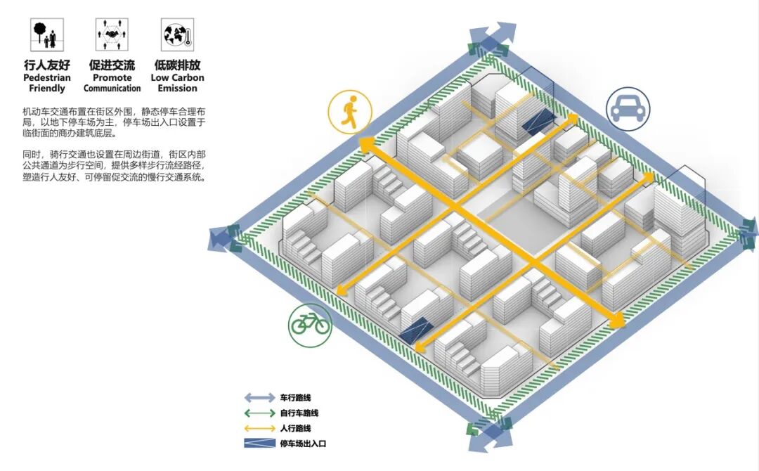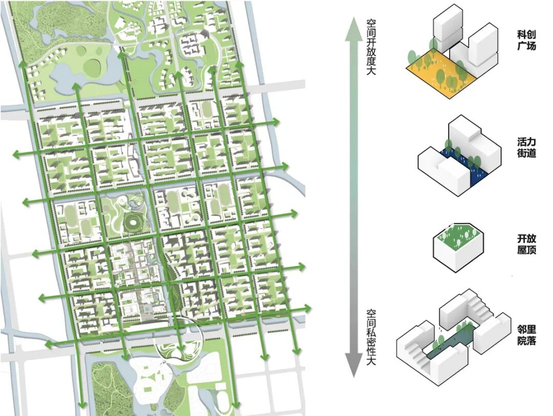 生态系统和路网结构秉持着使整体空间保持良好连接性和可达性的原则,构建了连接场地内外的景观网络,保持场地周边生态系统的完整性,将景观元素张弛有度的渗透进城市空间,保持柔性边界,避免城市空间和自然空间的人为割裂;交通体系合理深化了小街密路的空间尺度,并注重和景观体系及公共空间的灵活契合。