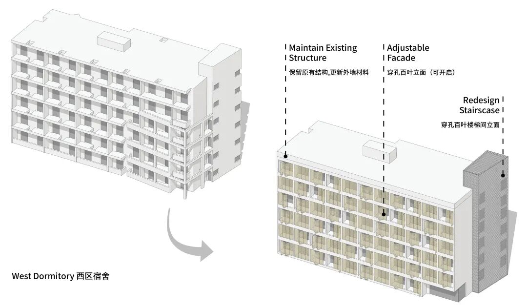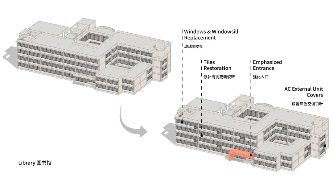 向左滑动查看改造设计: 图书馆、南区餐厅、西区宿舍楼