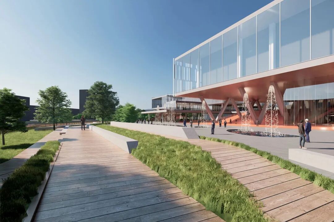 集成电路产教平台位于校区临河边界,拆除老旧礼堂和配套设施用房,保留城墙遗址。采用开放边界策略,面对护城河的城墙礼堂以V字支撑结构抬升,简洁的几何轮廓与通透开放的玻璃幕墙。建筑整体沿河融于城墙遗址绿化景观带,呈现独特且开放的滨河绿化校园边界。