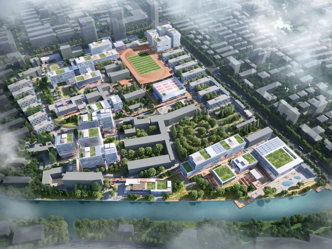 从入口广场到滨河景观, 庭院散落在各区域, 因地制宜展现古迹广场、滨水绿化广场、空中绿化连廊、 屋顶花园等不同形式的绿色校园场景。新旧校园建筑也同样加入绿色建筑节能措施,绿色建材、碳中和节能措施、建筑智能遮阳、光伏系统,成为可持续的生态友好型的设计。