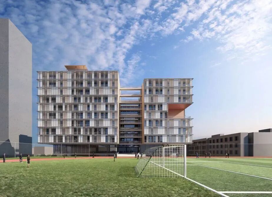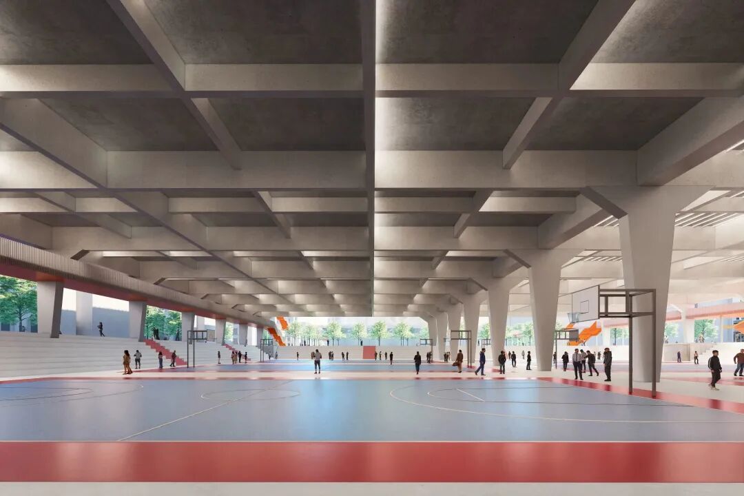 运动生活区将原有北区食堂下沉至底层,与新建的上层750间宿舍结合,并与运动场馆连接。抬升户外运动场,打造双层运动空间(地下风雨运动场,地上户外球场),与南侧三层的室内体育馆,组成完备便捷的校园运动设施系统。
