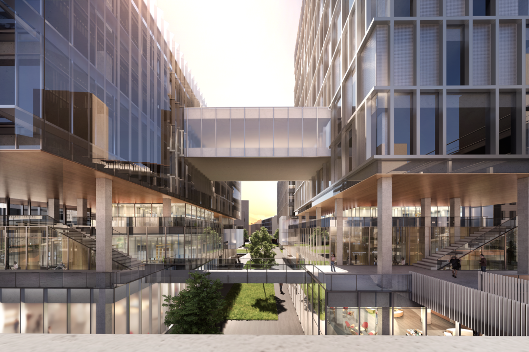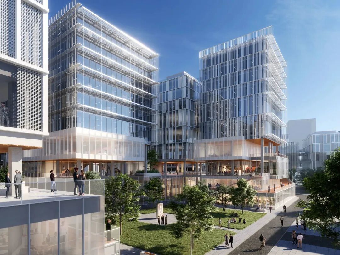 沿着塔城路进入校园,上海微电子产业学院的微电子之门立于北区广场,白色铝板与玻璃带来科技感。微电子商业科创区的南侧建筑降低了高度,减少对北侧遮挡。底层部分架空,与空中连廊、下沉广场有机组合,形成错落关系。