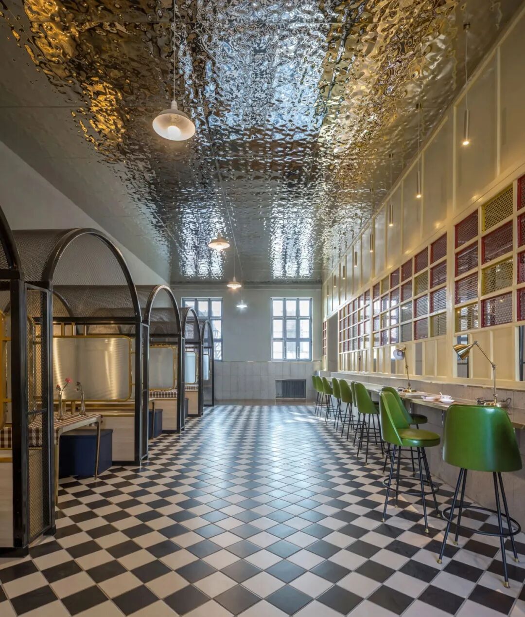Aurelien Chen 希望将拱门融入设计中,以呼应附近历史建筑的细节。 这是通过在餐厅区增加一排带拱形檐篷的摊位来实现的。