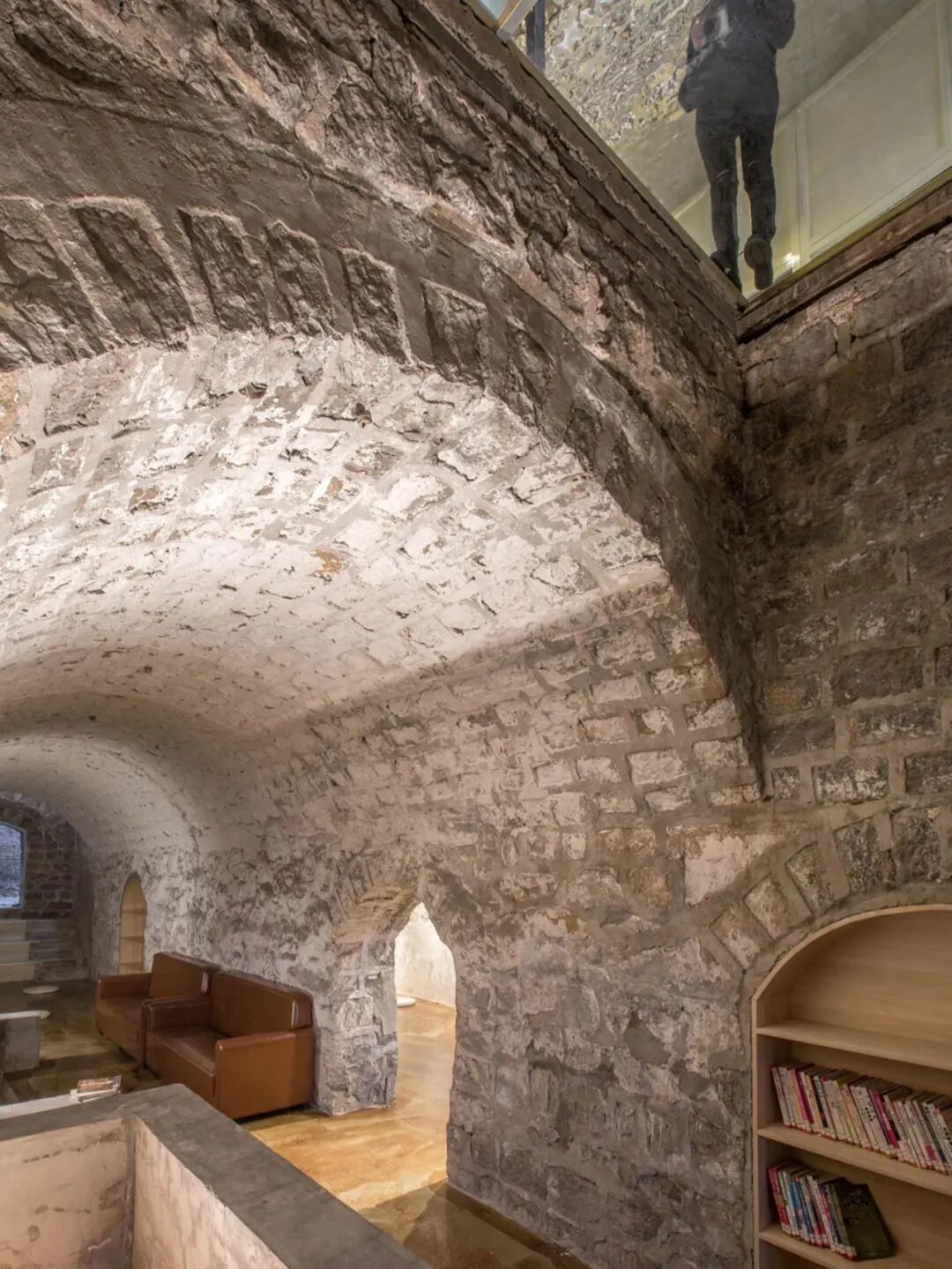 拱顶以其原始状态保存,只需极少的干预就可以将其转变为阅读角和展览区。 玻璃地板在这些空间和上面的公共区域之间保持视觉联系。