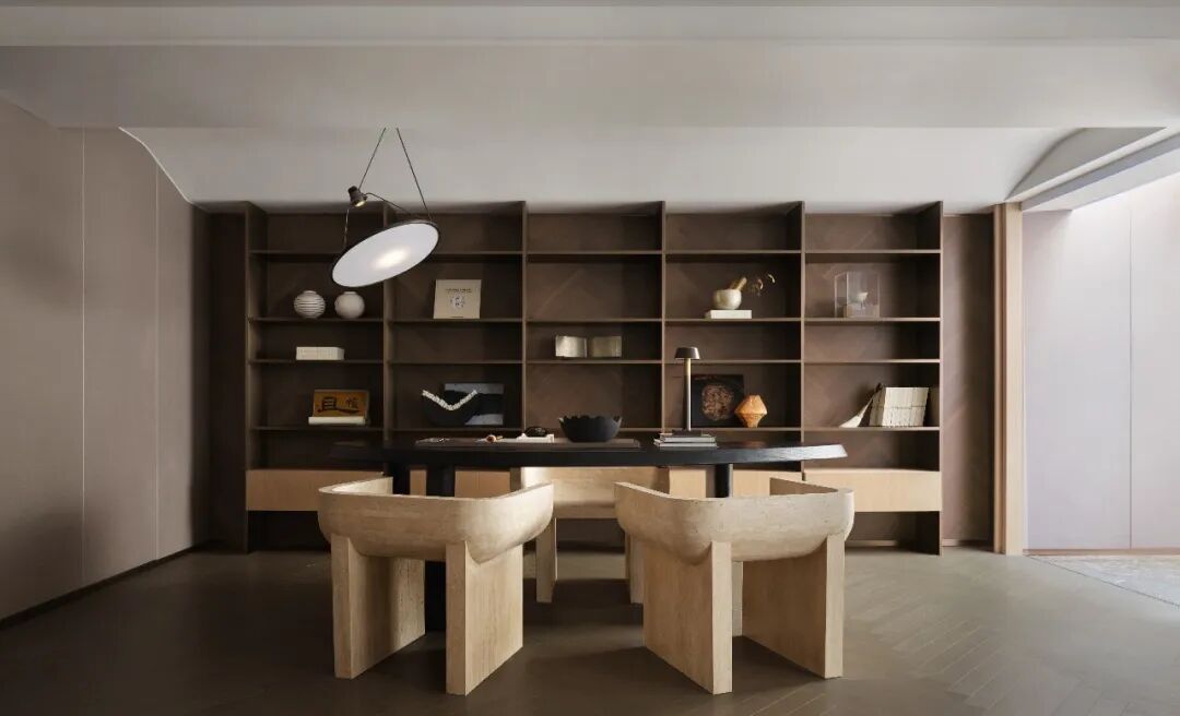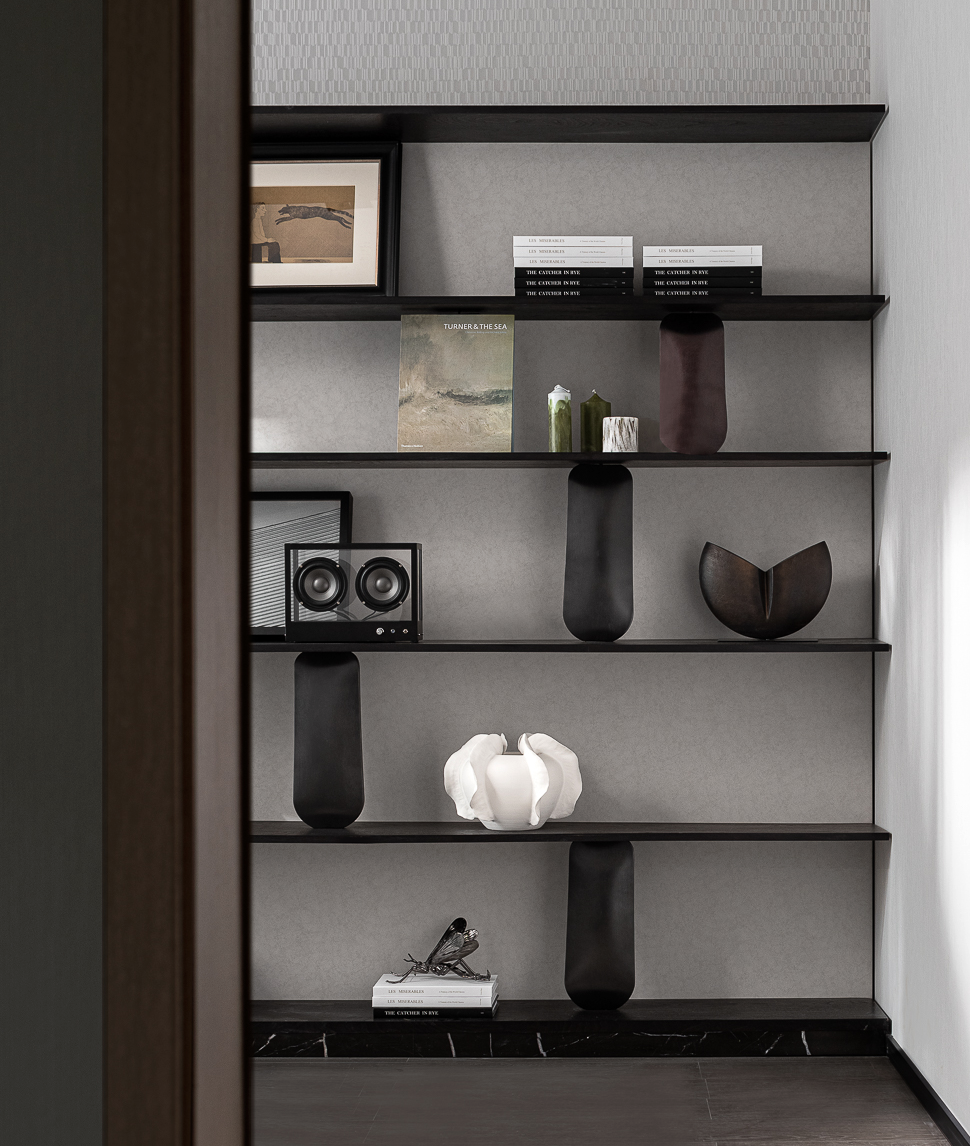 布设精雅的书房,是一处静心办公或读书的场域,亦是居者精神的休憩地。从情境的勾勒入手,墙面书柜的物件点缀,生动地流露出主人的不凡品味;一隅的暗绿绒面单椅,加之嵌着理石花纹的茶几式扶手、几幅线条与几何样式的挂画,构就着一张一弛的仪式感,昭示生活中的细腻与质感。