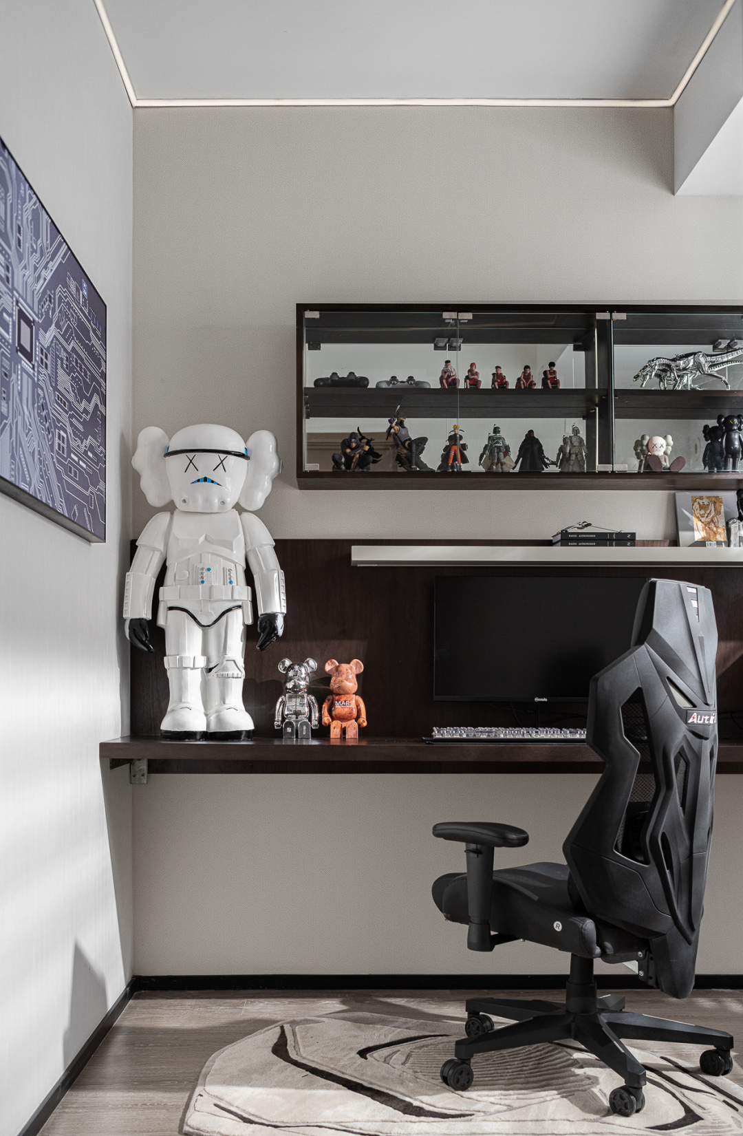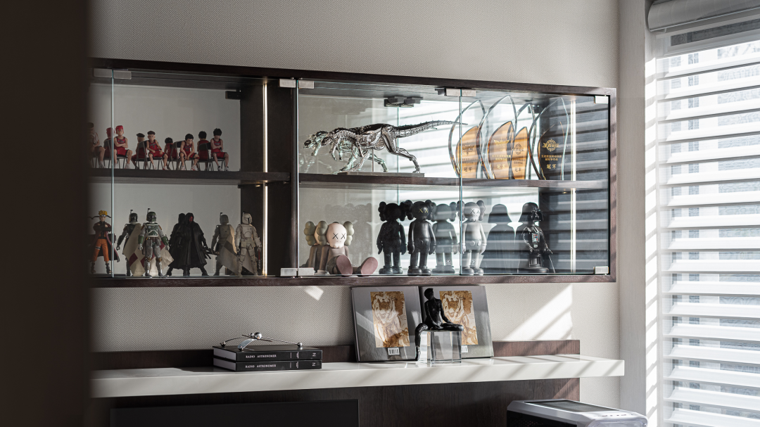 走进书房,便踏入了一个潮玩收藏家的精彩世界。在有限的空间中,整齐排列的各式卡通手办,突破了样板间的固有展示印象,而是通过生动的情景化布置,赋予生动的空间性格,在演绎居者的潮趣灵魂之余,承载着涌动于人与空间中的限定快乐。