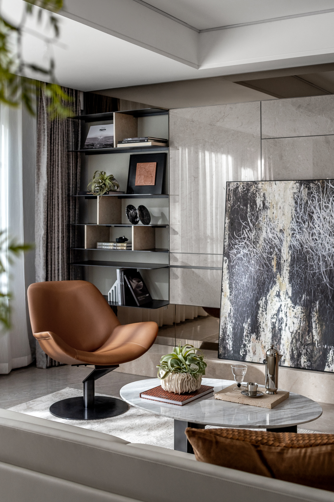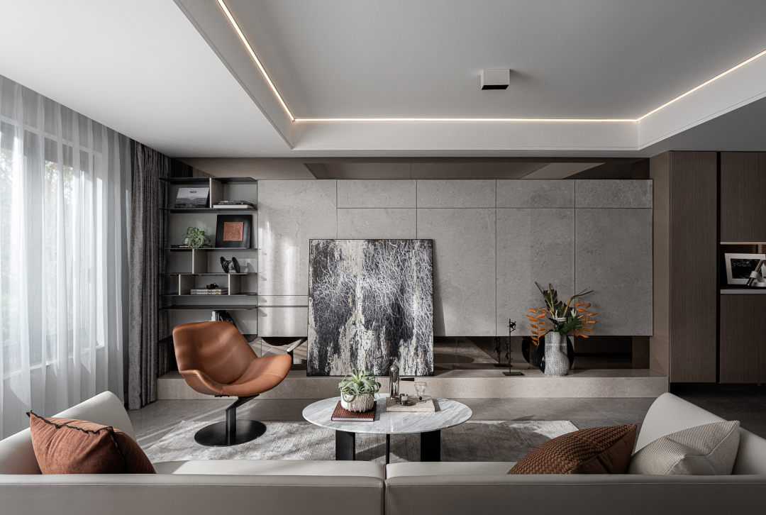 简雅色彩中跳跃的暖橙、杂乱无章的抽象线条版画、工艺精致的皮质沙发与大理石茶几......设计师对软饰的精心铺设,带着深浅呼应、层次分明的艺术张力,淋漓尽致地宣扬着年轻Z世代对生活与时尚的态度,鲜明个性中含有饱满的生活趣意。