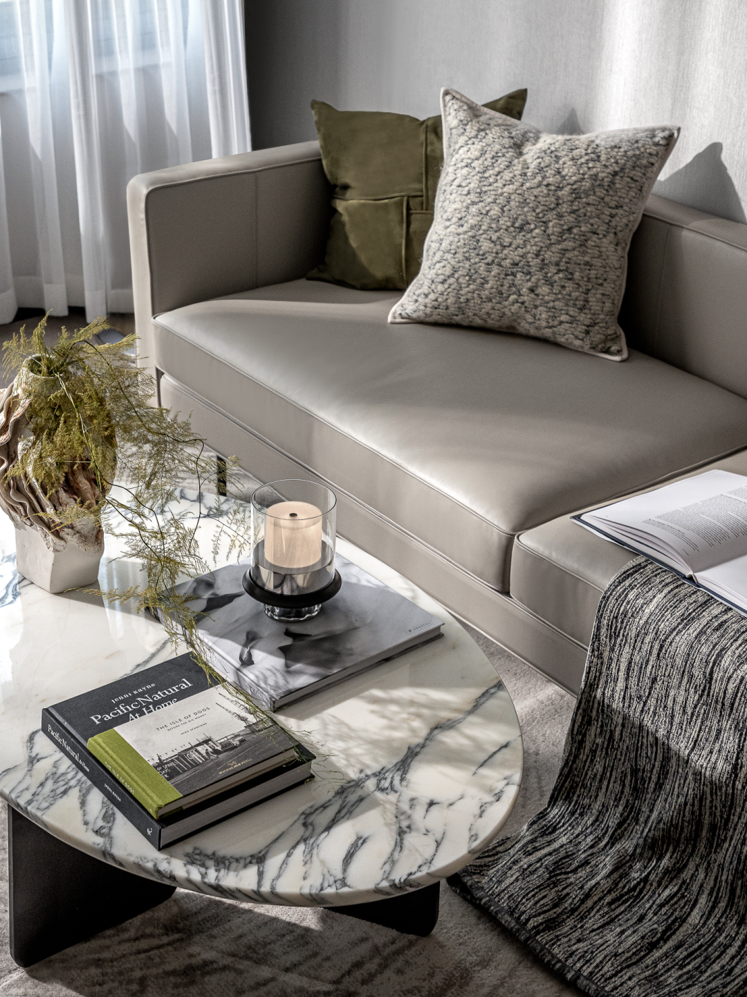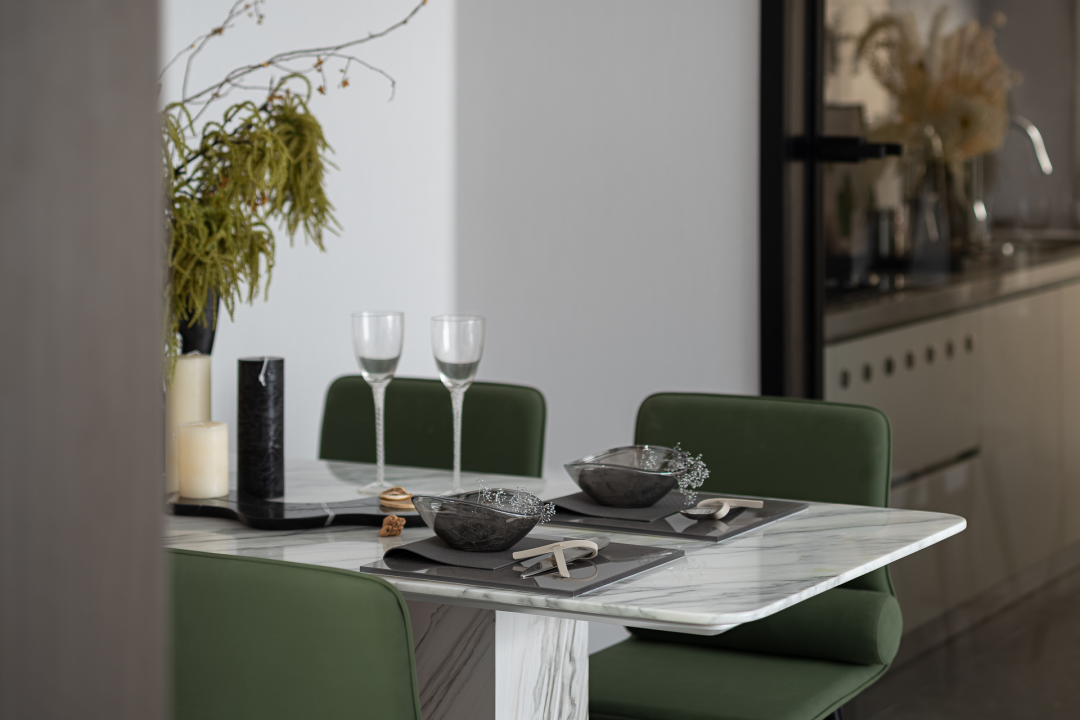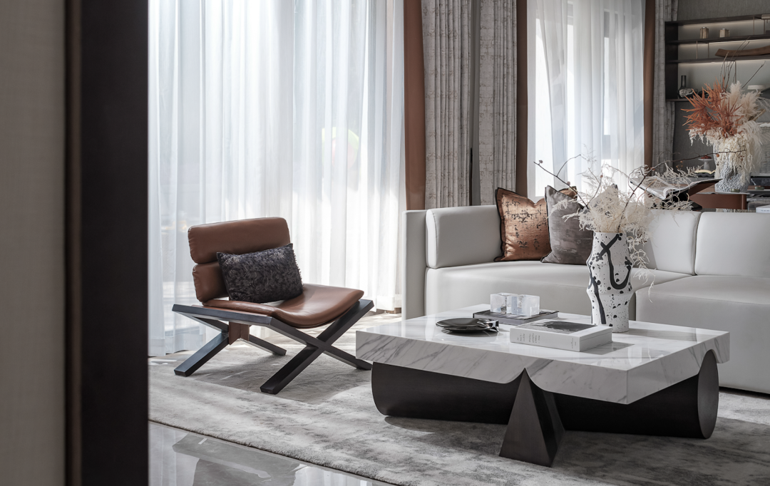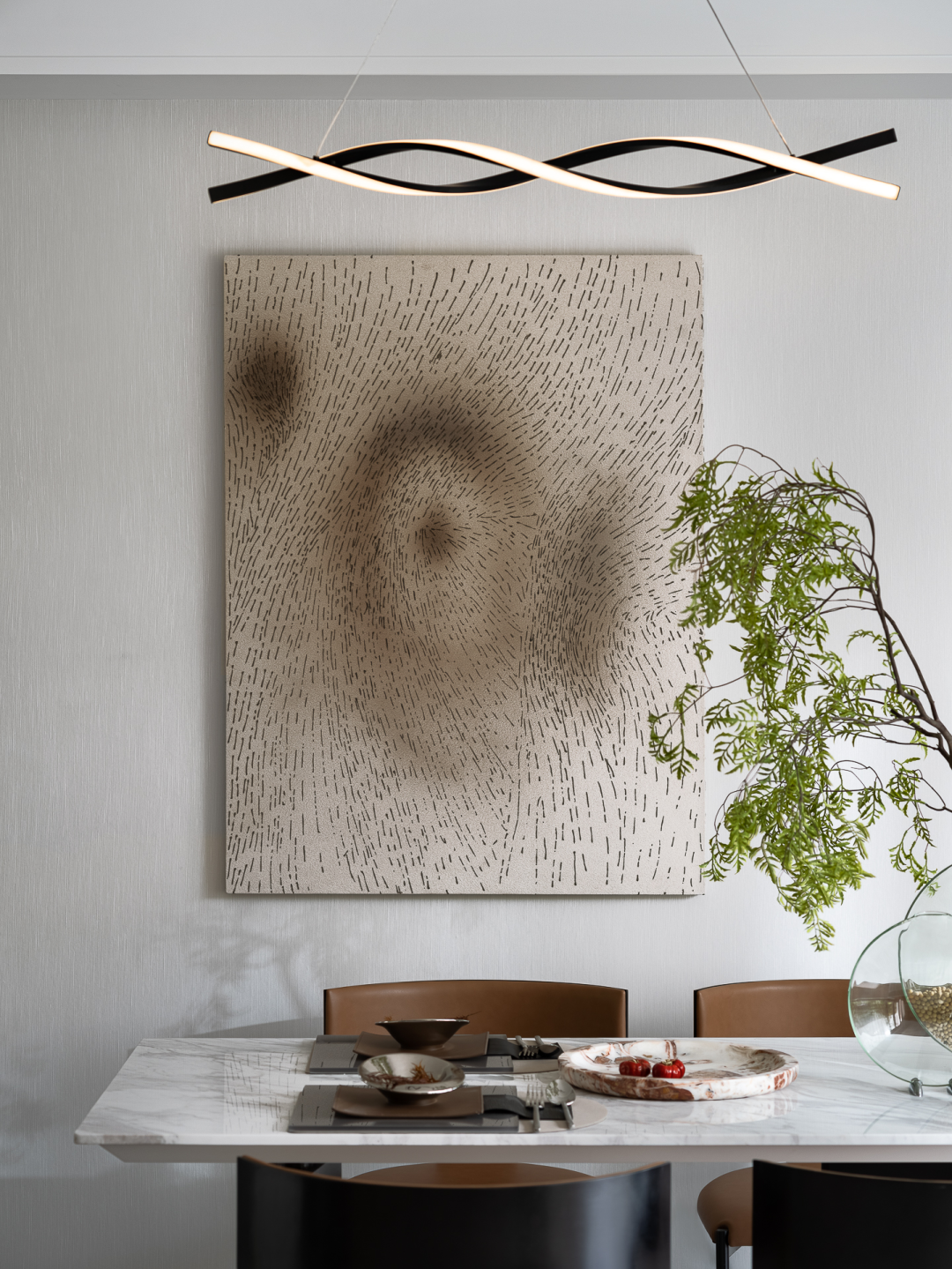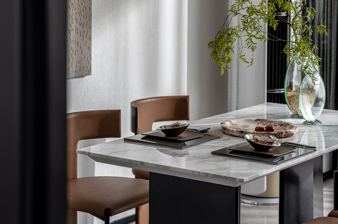 在去繁从简的构设中,咖棕皮质与通透的大理石台面,勾勒着品质都会生活的美学情调;灯饰的曲线与挂画的线条肌理,形成一笔互为呼应的空间画面;做工精良的餐具与玻璃花器里的纤细绿植,更于细节的观照中,描摹一蔬一食的日常仪式。