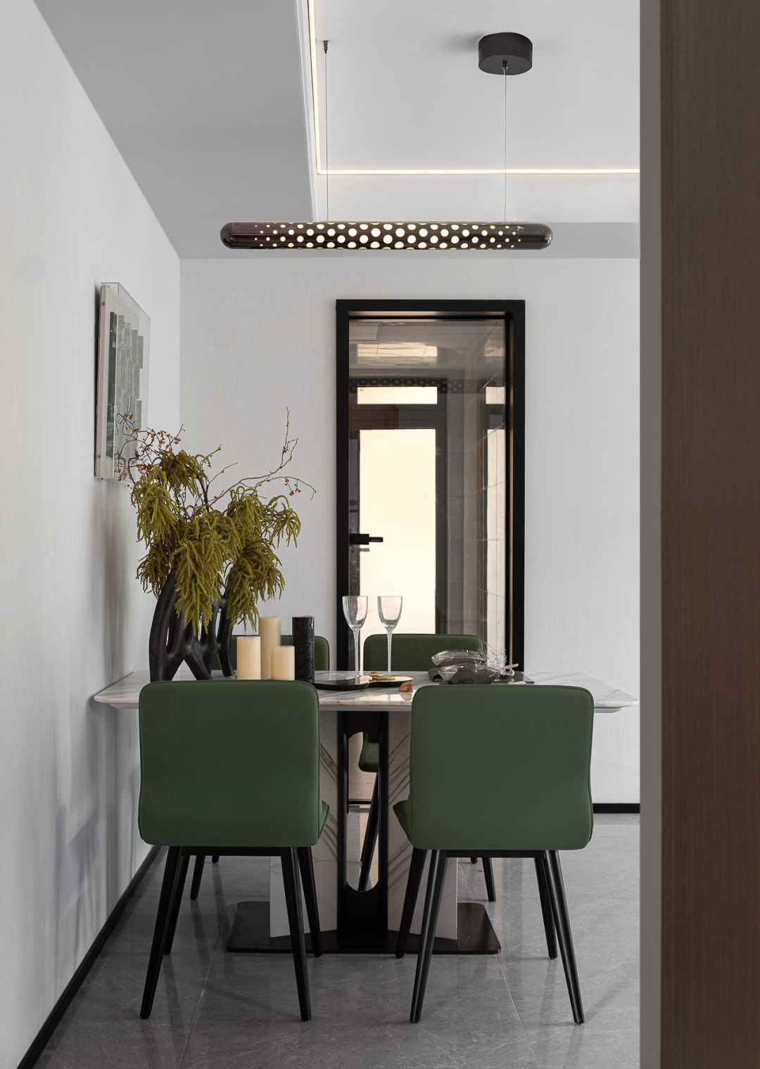 延续森林绿的色彩,开放式用餐区将一派富有无限生机的画面巧妙衔接。“在自然野韵的大片着墨下,我们希望设计诠释的是,使用者的生活美学态度,以及他们于忙碌的都市社会中,深至内心的本真精神诉求。”