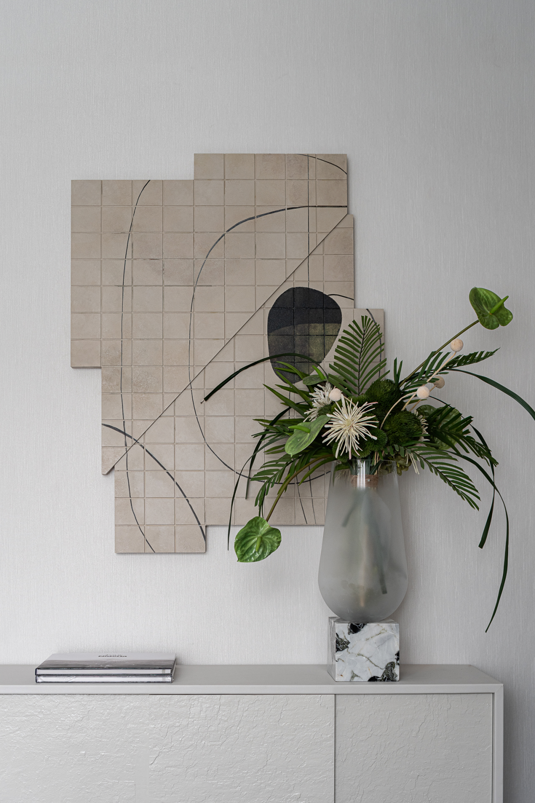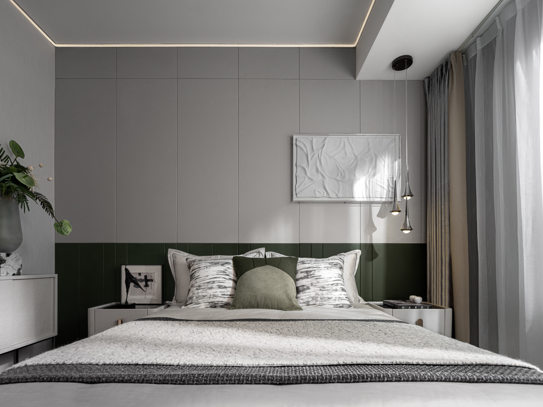 卧室向来是主人性格与魅力的集中展演地。在此,从简白与墨绿的自然调色,至墙面拼贴的抽象艺术几何装饰、草木葱茏的花艺点缀,设计师走入居者关于理想家的设定,并真实还原了一个“生活美学家”的居住场景,令空间饱含热爱生活的内在力量。