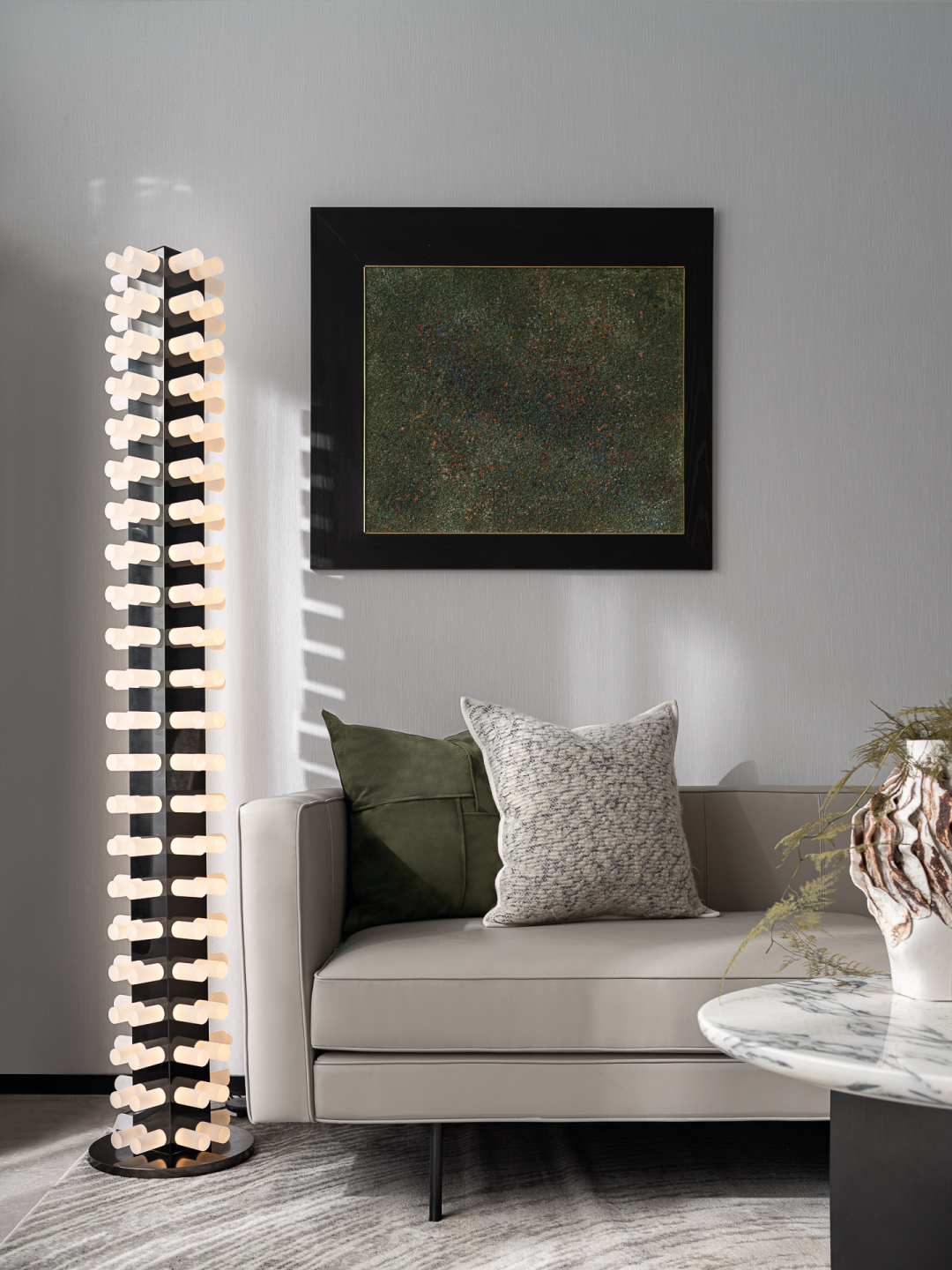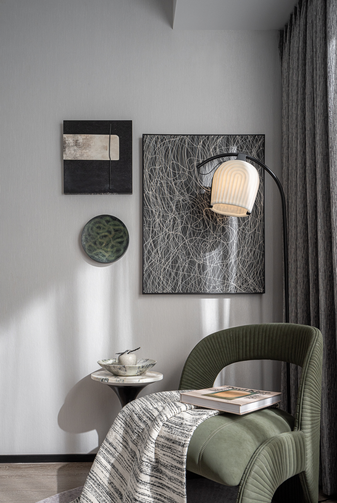 走入于此,一派绿意点点的生机,或活跃于一株身姿曼妙的枝叶上,或萦绕在纯白的蚕丝落地灯、大幅绿色底板的艺术画中,顺着艺术的脉络尽情伸展。