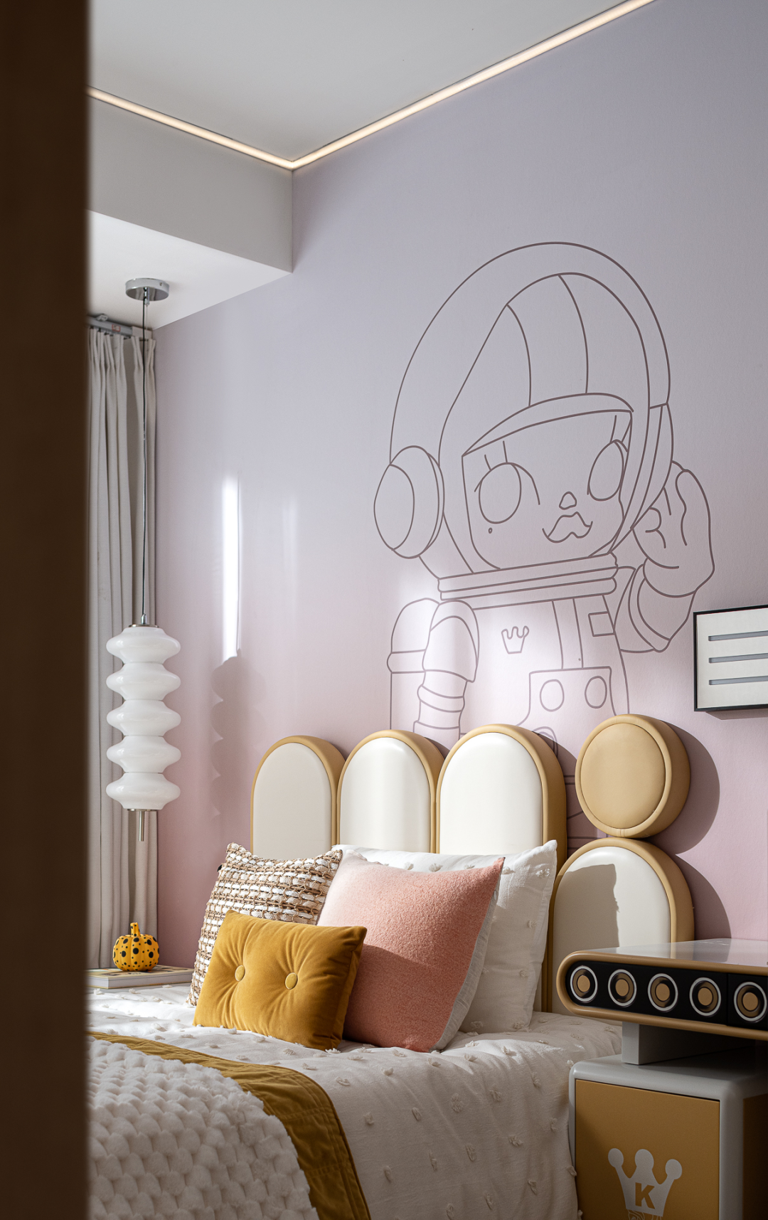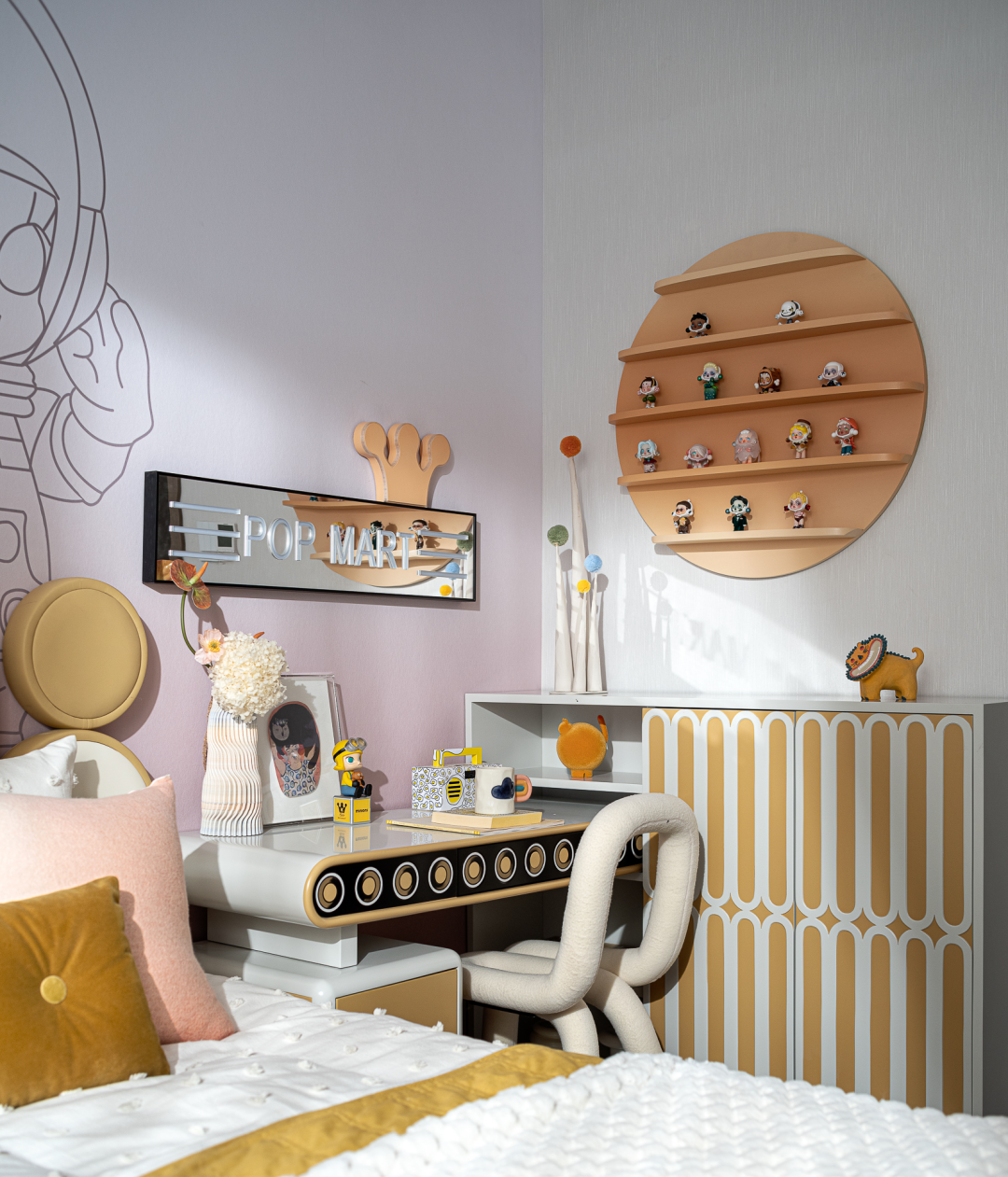 在设计师的笔下,交织着柠檬黄与少女粉的女儿房,延展出温柔又不失潮趣的空间曲调。跟随这一独特视角展开,泡泡玛特的主题营造、圆润的弧线轨迹、玩趣十足的动物摆件,赋予空间有关于童梦生活的丰富联想,为温馨的家庭记忆,添上一抹别样的美妙。