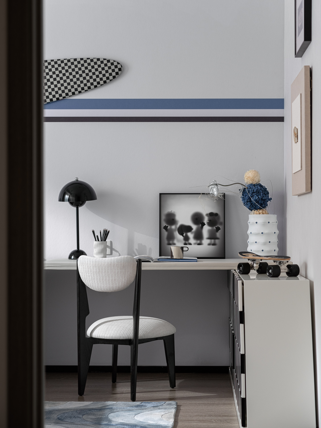 灵动跃趣的儿童房,住着一个活泼且喜爱滑板运动的男孩。走进这片设计营造的小天地中,眼前是卡通故事书中诉说的童趣和美好,是活跃于潮流玩具与棋盘格图案中的天真和调皮,更是孩童个性里,焕发青春活力的自由。