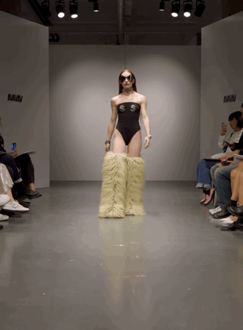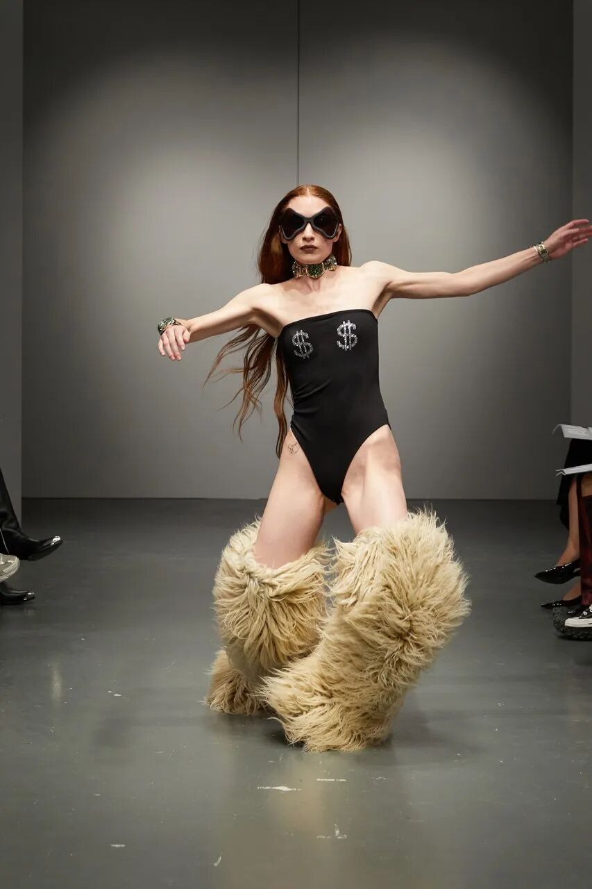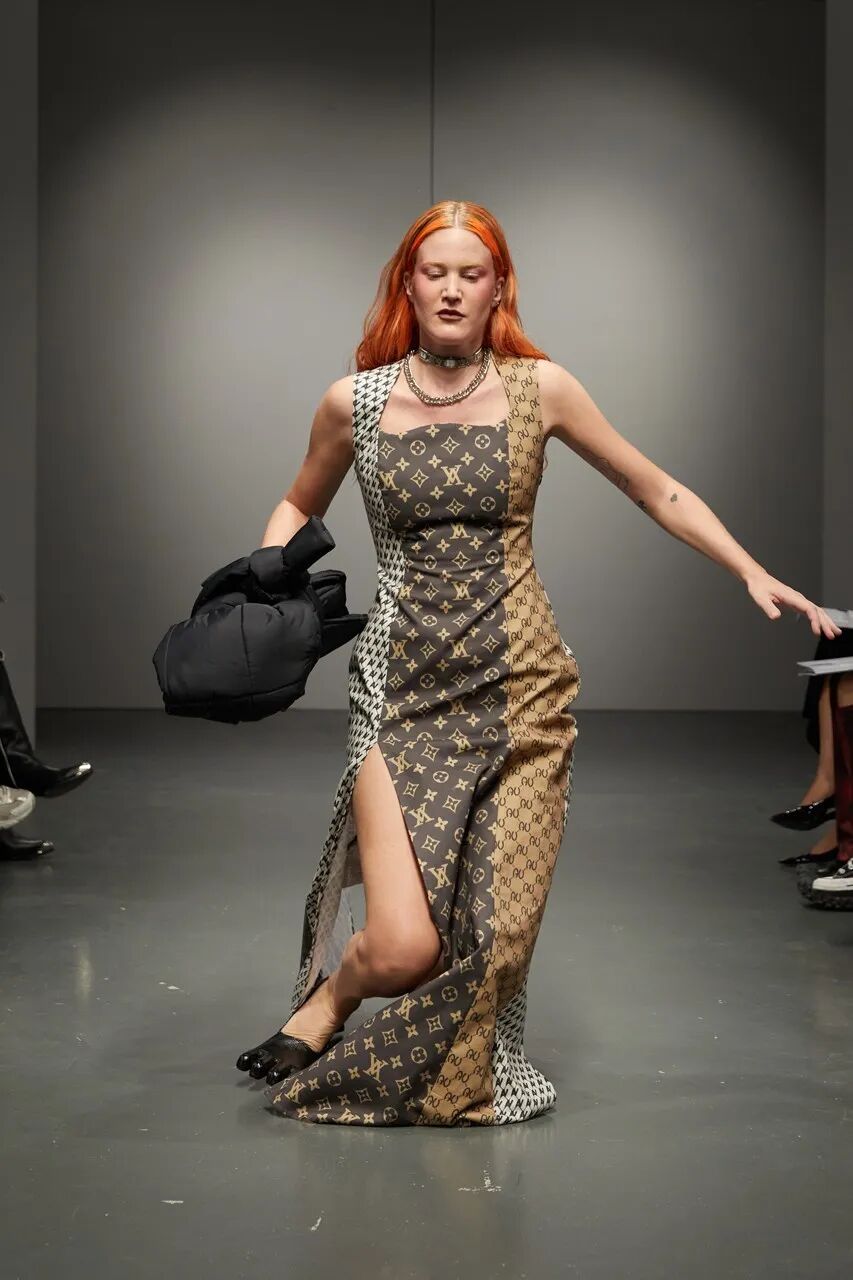 大秀虽然玩得很野,但其实这是AVAVAV第一次在米兰时装周走秀。宽大垫肩夸张做作,美元符号随处可见,包臀长裙也由疑似奢侈品牌面料拼接而成。