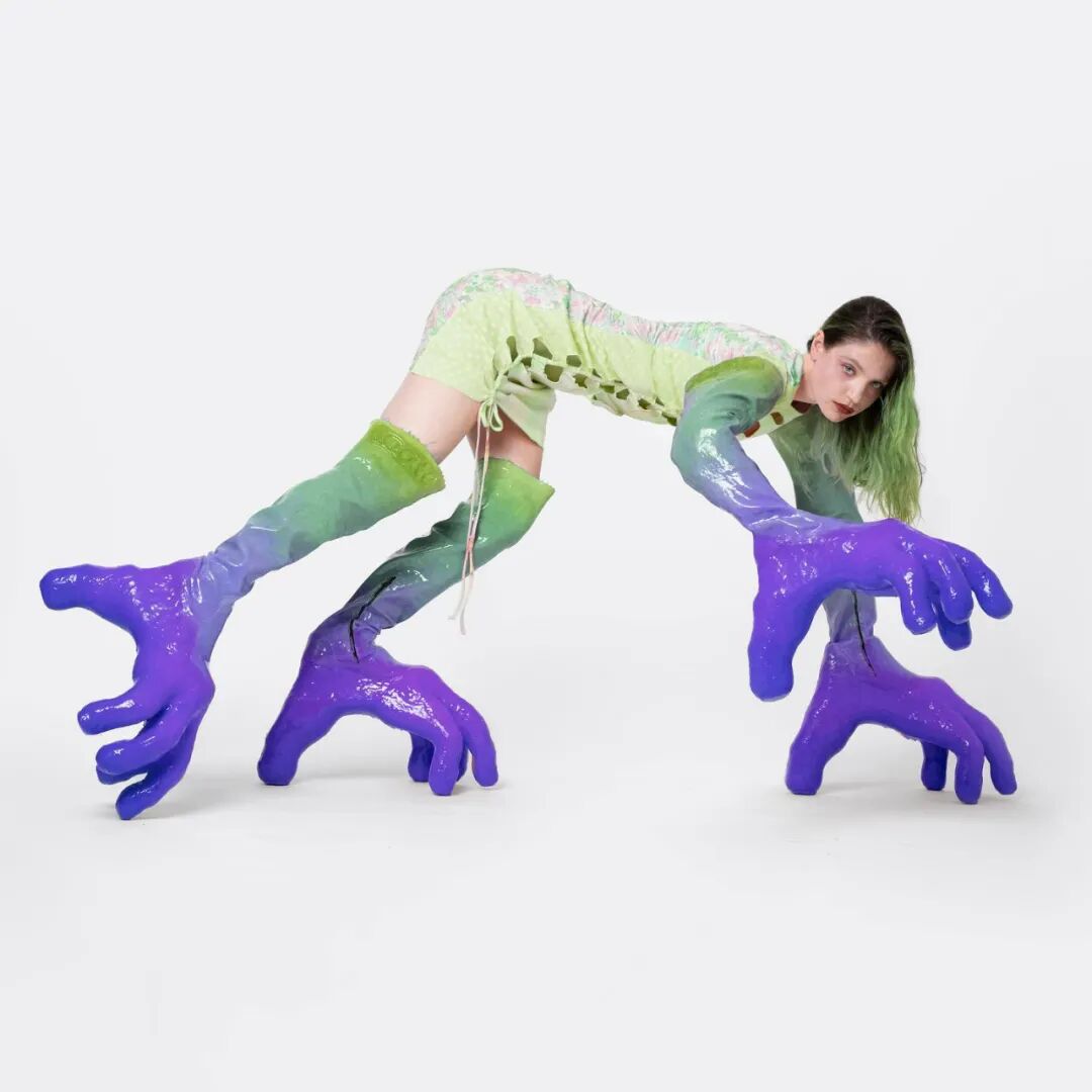 我喜欢突破可穿戴时尚的界限;这是我最大的动力。我想做的是通过变形身体来创造新的形状,其中一个部分是熟悉的,然后重新组合。”就比如爪形鞋设计理念在某种程度上是非常简单的,因为它有我们熟悉的手指形状。但从另一方面来说,也是困难的,因为它挑战了可穿戴设备。这就是我想要执行这个想法的原因;因为它既简单又有挑战性。