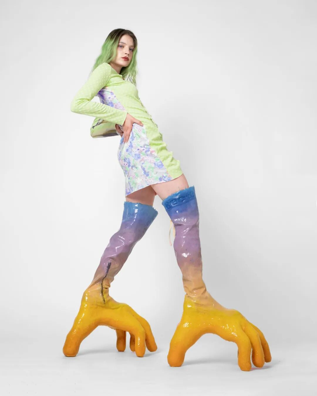 这是该品牌推出的第一个超前卫四趾靴系列。Karlsson 能够将她的作品以数字形式呈现出来,这使得她能够通过传统的时尚实践设计出以前几乎不可能完成的设计。