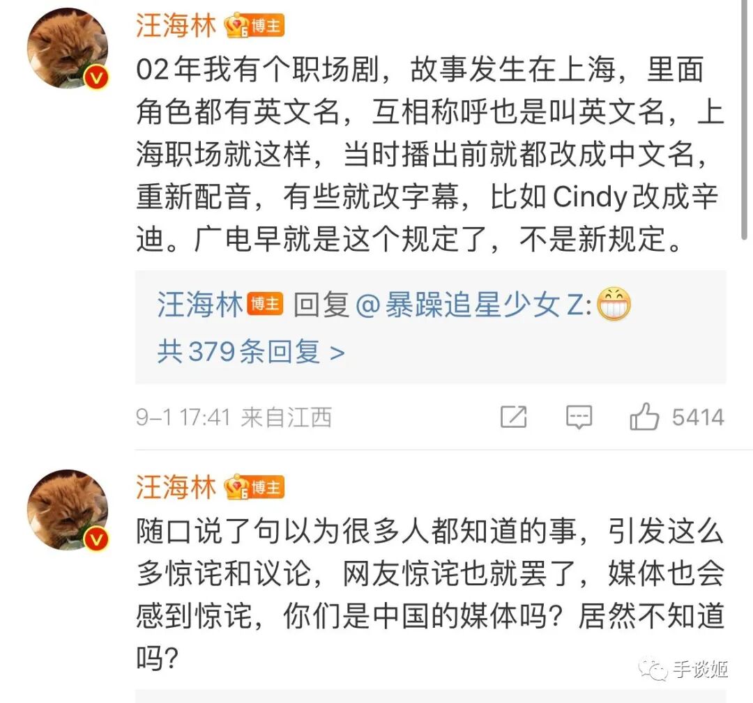 他还说,其实这是老早以前的规定了。知名艺人angelababy在署名的时候也得改成杨颖的本名,而他在2002年担当编剧的职场剧中就出现过要把英文名字改成中文名的情况。