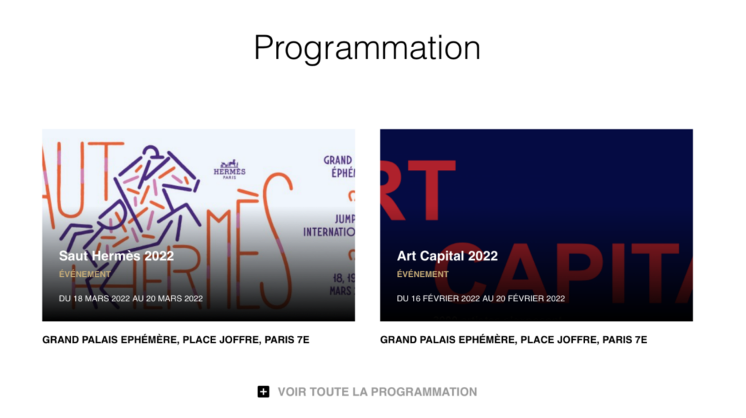 Lieu événementiel, le Grand Palais Éphémère est destiné à accueillir pendant la restauration du Grand Palais les événements organisés dans la Nef. Une riche programmation déployée par la Rmn - Grand Palais y est aussi proposée au public : expositions, spectacle vivant et événements ouverts à tous les publics rythment l'année. Site olympique, le Grand Palais Éphémère abritera à l’été 2024 les épreuves de judo et de lutte, de rugby en fauteuil et de para-judo