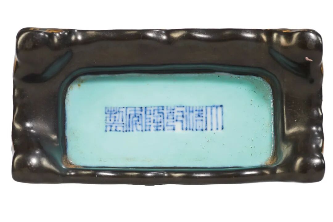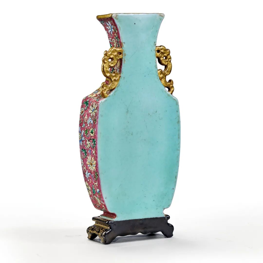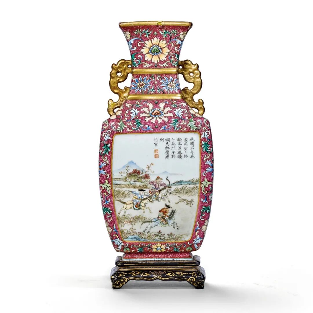 洋彩狩猎图题诗璧瓶 青花六字篆书横款