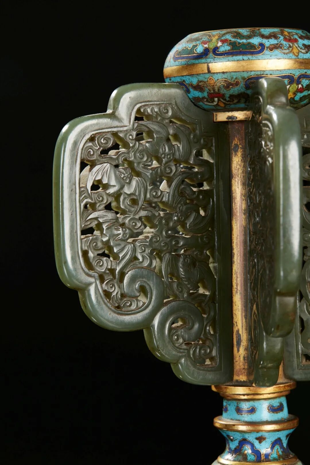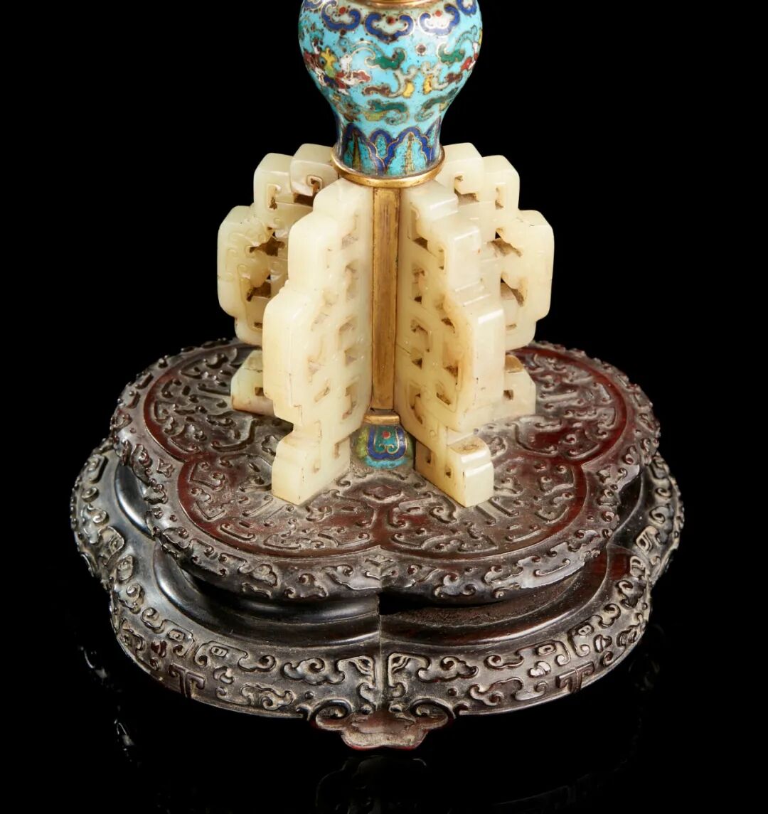 碧玉、青黄玉及掐缧珐琅紫檀座「洪福齐天纹」冠架 一对