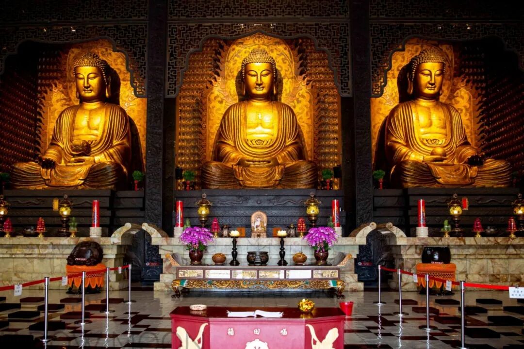 这「横三世佛」的三尊造像,中间为释迦牟尼,主掌娑婆世界;右方为阿弥陀佛,主掌西方极乐世界;左方为药师佛,主掌东方净琉璃世界。