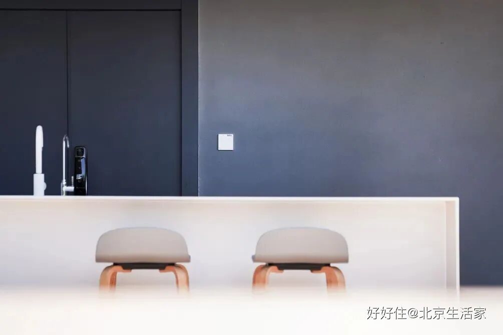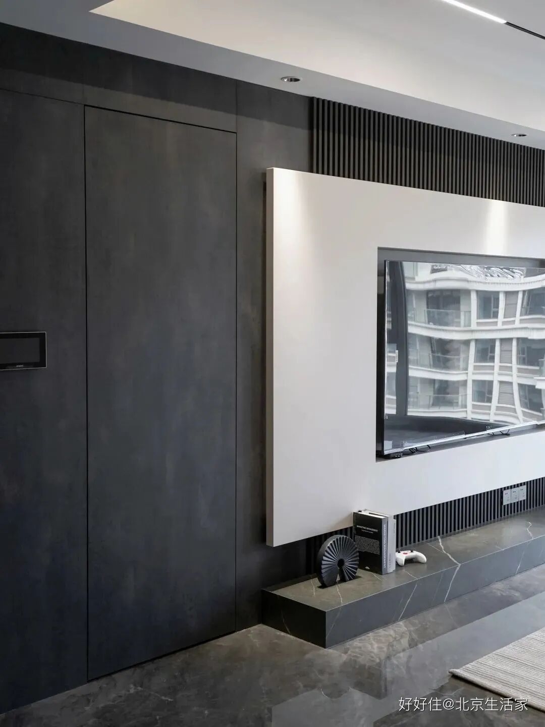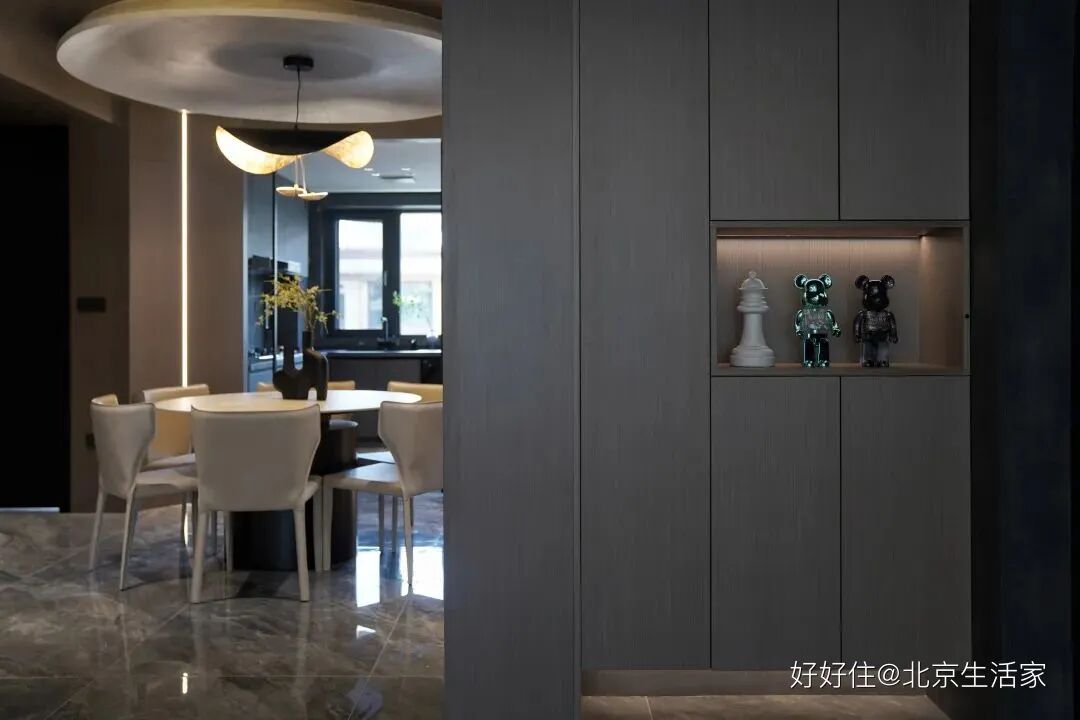北京生活家:一进门就拥有大宅仪式感,玄关墙选用了深色哑光岩板,通过打磨做成了凹凸造型,凸显其层次感,两边又用了超薄的木饰面板来做弧形包裹住,回家一开门就能感受到亲密和放松。