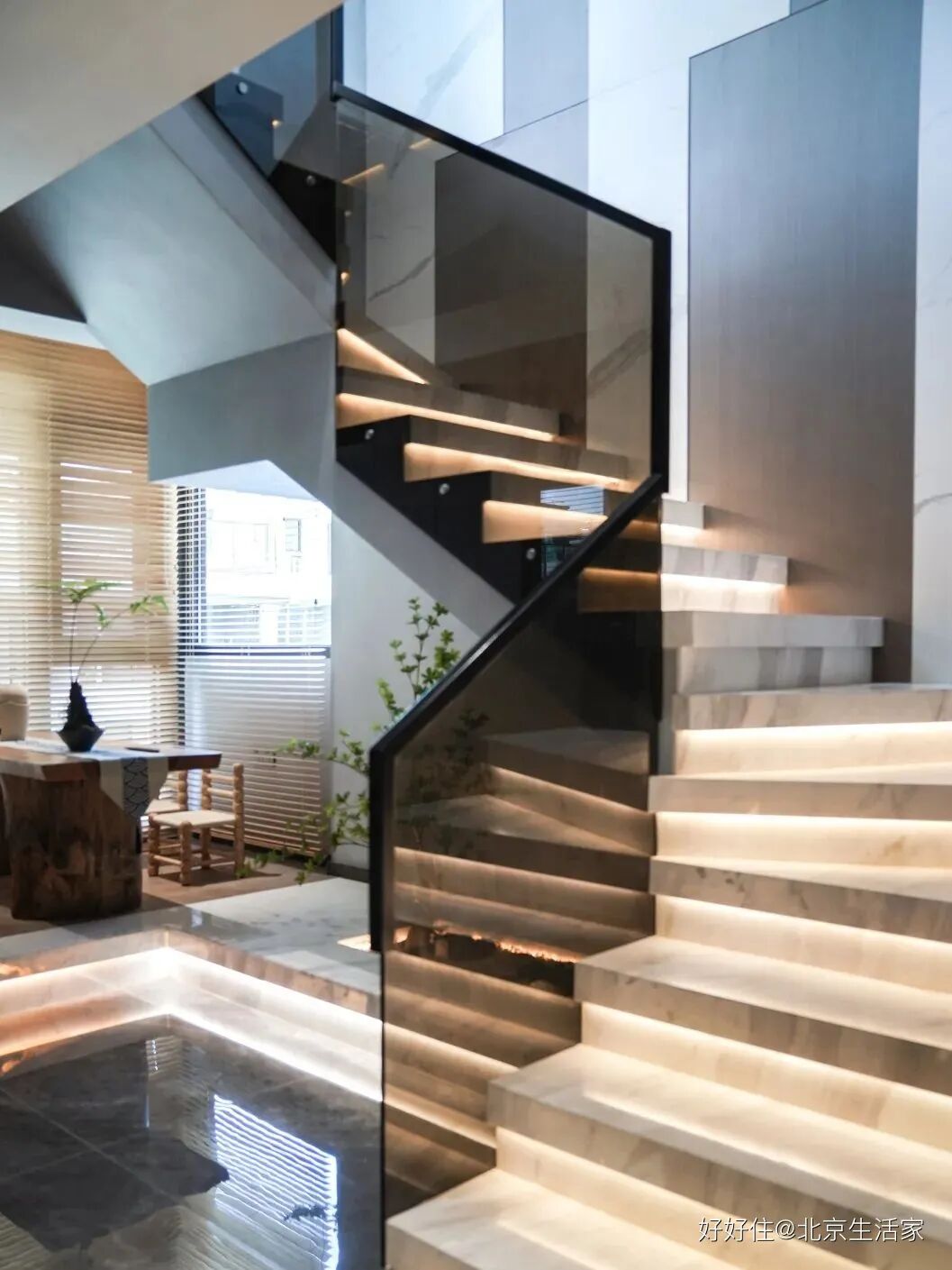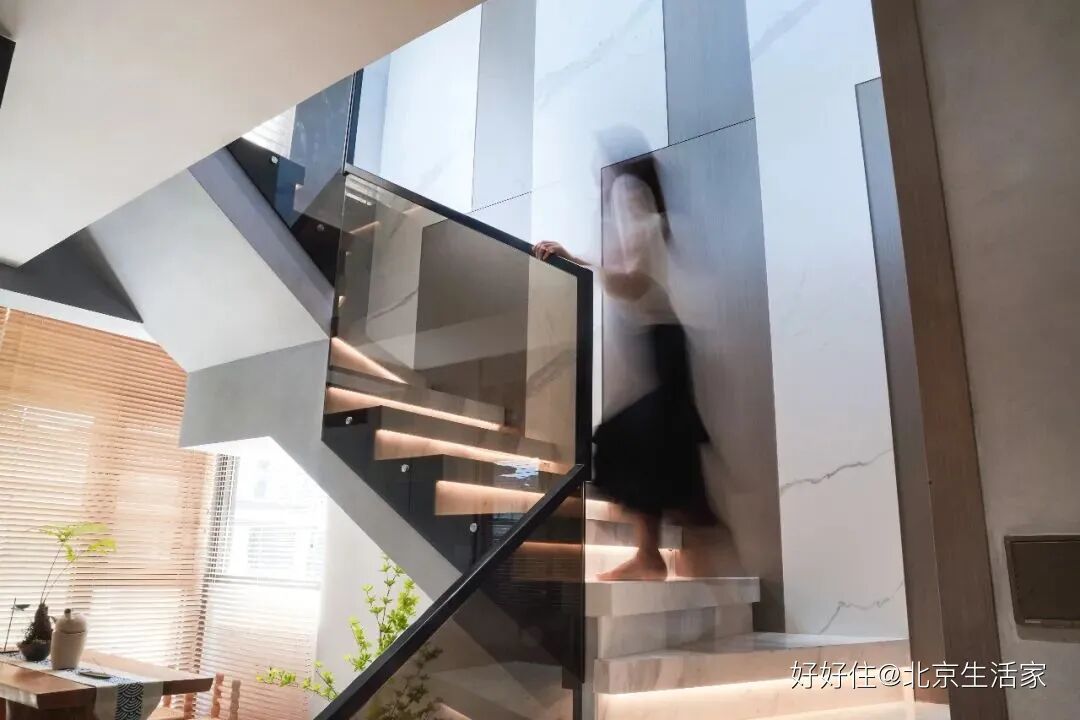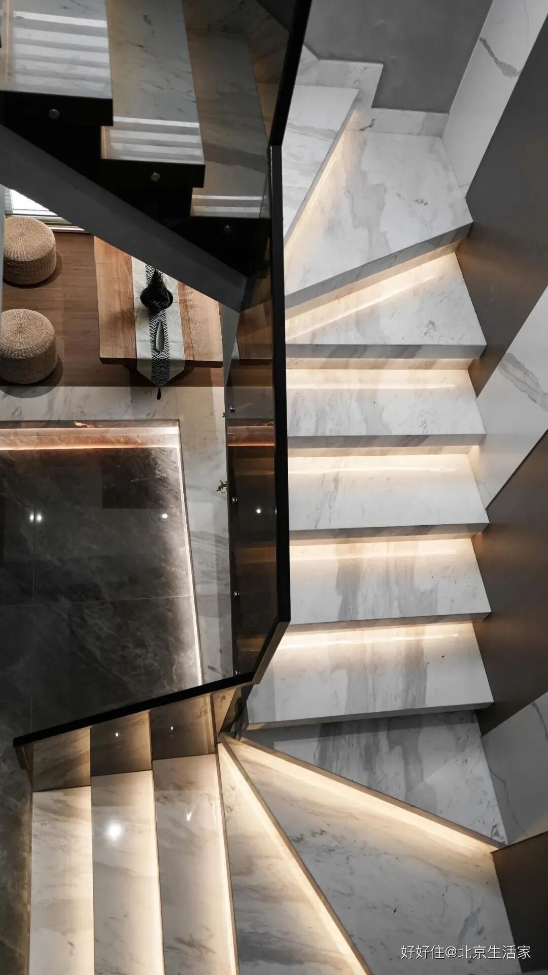 北京生活家:拾级而上,台阶在一步步中点亮,最终选择的爵士白材质让楼梯空间不显压抑,整个楼梯空间更有品质。