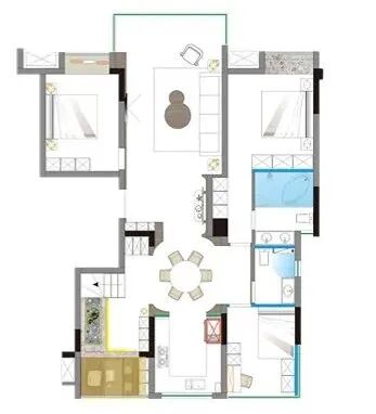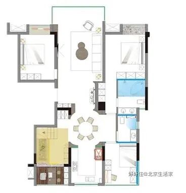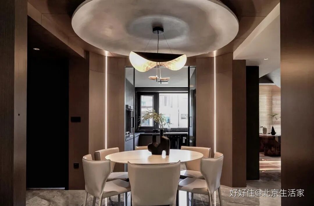 北京生活家:餐厅打破了常规,打造出圆形餐厅来搭配大圆桌,让整个空间都灵动起来;并且扩大厨房面积,用隐形联动门阻挡了油烟溢出。
