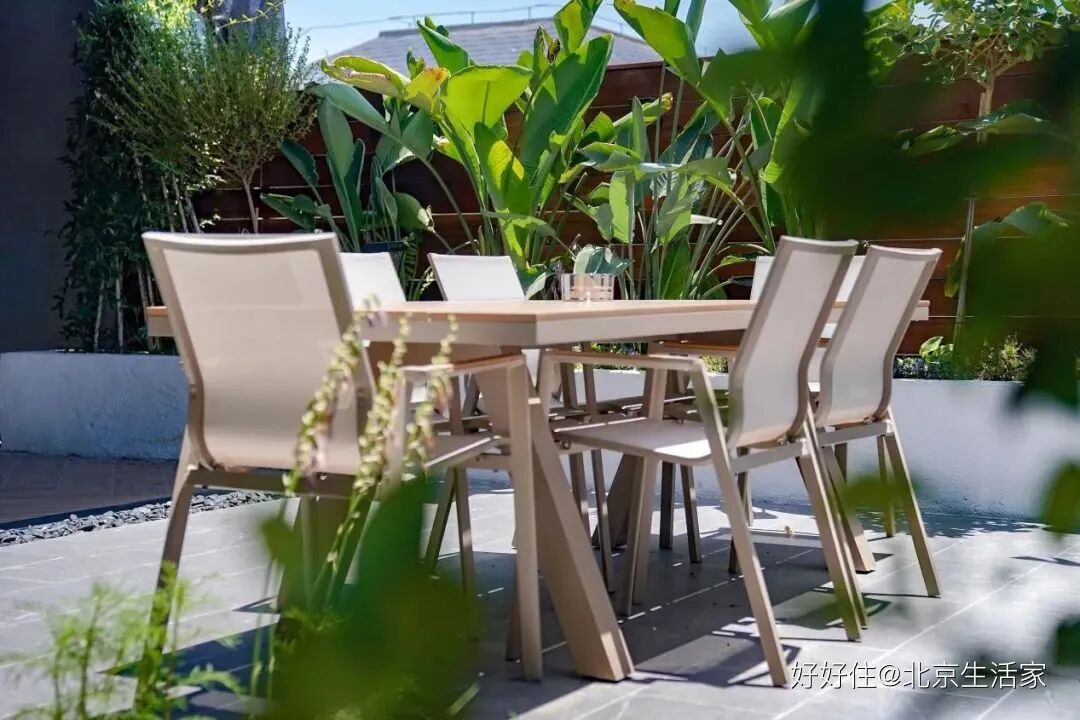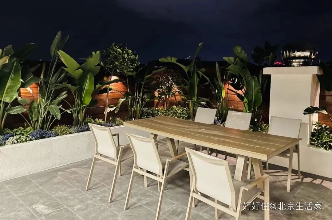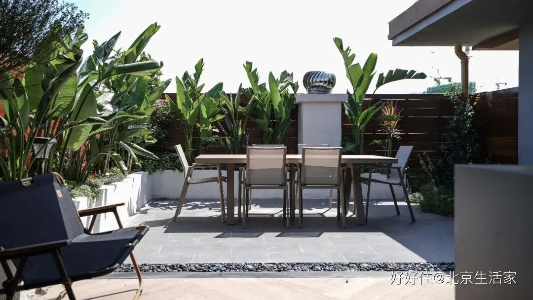 北京生活家:在不能远足的日子里,在这套房子里,不用出门也可以在自家花园享受到露营生活。防腐木围栏保障空间通风和散热,就算是夏季也不会太闷热,还有白色水泥漆花台,种植了热带阔叶绿植,直接打造度假风。
