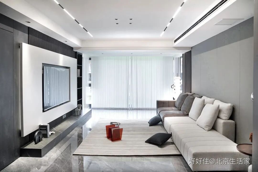 北京生活家:电视背景墙还另藏玄机,旁边次卧做了隐形门,让电视墙延伸到入户门,整个客厅显得大气整洁。