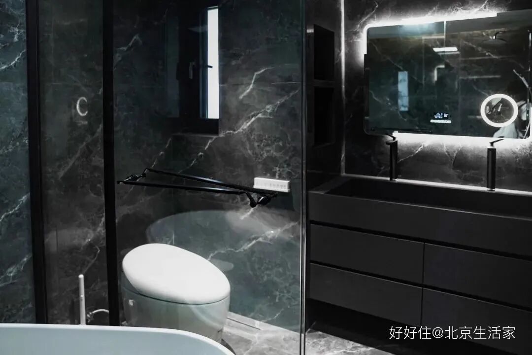 北京生活家:卫生间满足女业主的需求,轻触右下角的化妆镜打开灯光,镜子上还能显示天气,再打开音乐,女业主愉快地开始梳妆打扮。