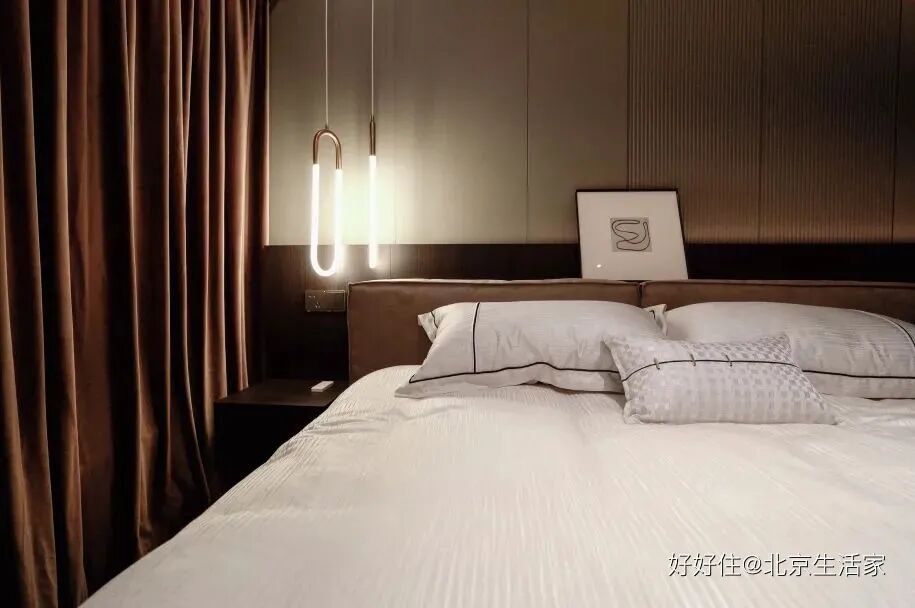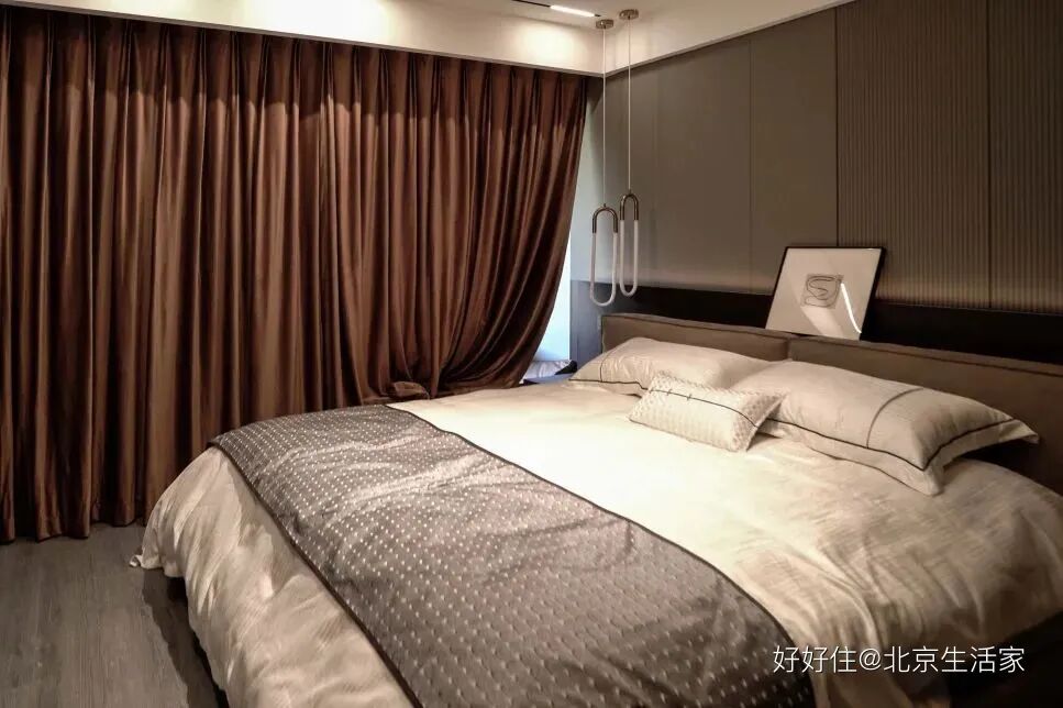 北京生活家:相比于其他空间的惊艳,主卧还是回归了平凡。以深色艺术漆奠定了空间的主调,搭配上柔和的灯光以及咖色不透光的窗帘,这私密的空间里,男女主人只想要纯粹的睡眠。