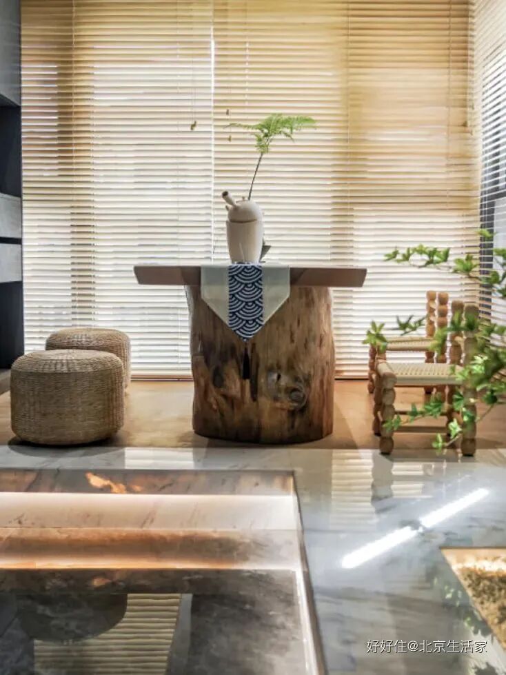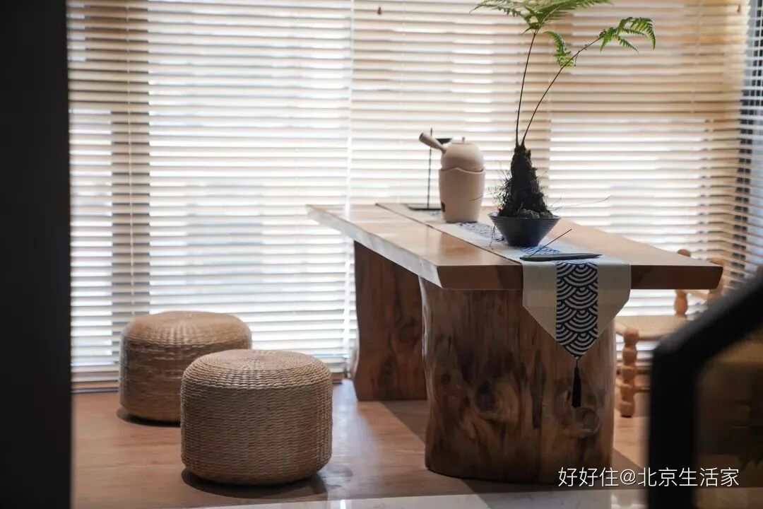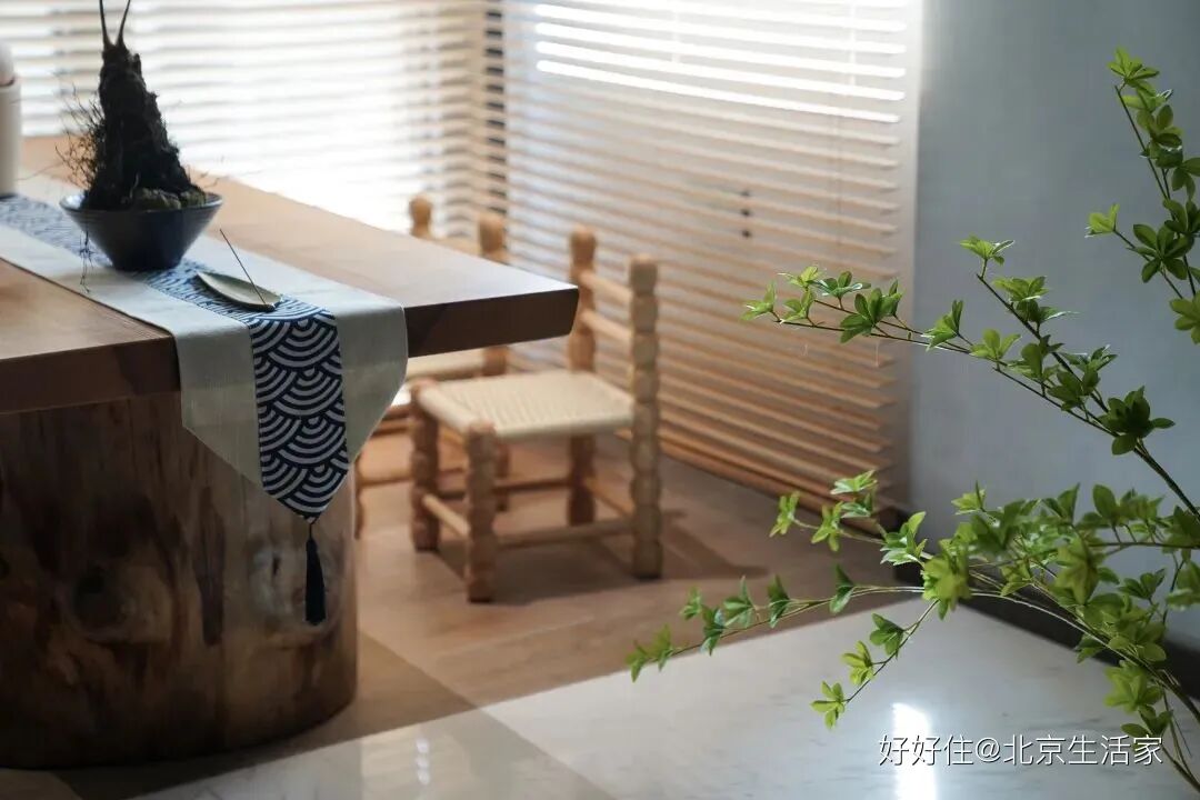 北京生活家:烹茶赏景,禅意袅袅。原木和石材的绝佳结合,现代与自然的碰撞,造就了家里此处静谧的一方天地。百叶窗、蒲团、绿植,摇曳的光线打在绿植上,让生活回归平静,喝茶、冥想、会友,在这里都变得真实。