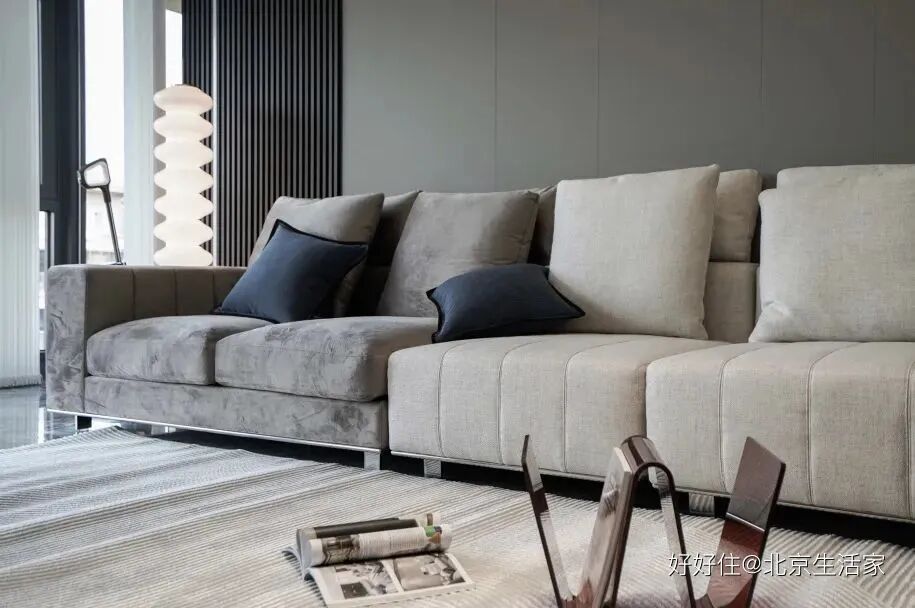 北京生活家:把阳台纳入客厅之后,整个空间更开阔,一整面的落地窗让光线和空气都可以自由流通,另外沙发的选择是以丝绒和棉麻的拼接,舒适温馨,不同场景给家人不同享受。