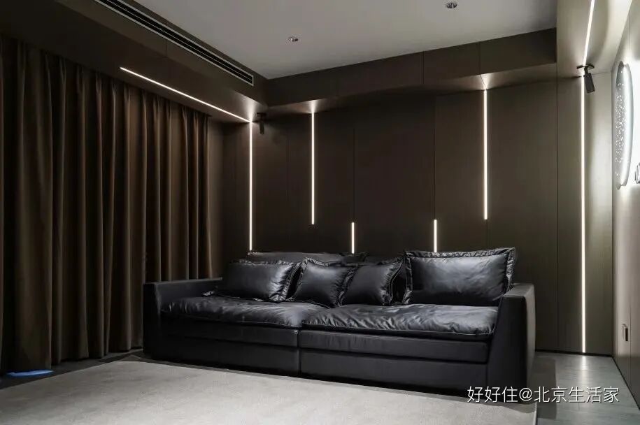 北京生活家:除了有舒适的露台,二楼还有私人影院,整个墙顶面都做了隔音板,环绕音响,柔软宽敞的沙发,不规则的线性灯搭配上圆形艺术壁灯,打造出极致的观影体验。