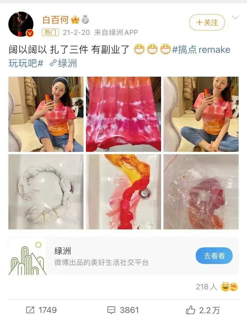 想必每个人小时候都曾将T恤染上过其他颜色,可能是红蓝墨水,也可能是不小心打翻的可乐。在无意间,人人都成为了“remake设计师”。微博上词条#搞点remake玩玩吧#讨论里有不少网友分享的renake作品,其中也不乏一些明星身影。白百何就曾分享过自己做的扎染T恤,低下不少粉丝都在求手工教程。