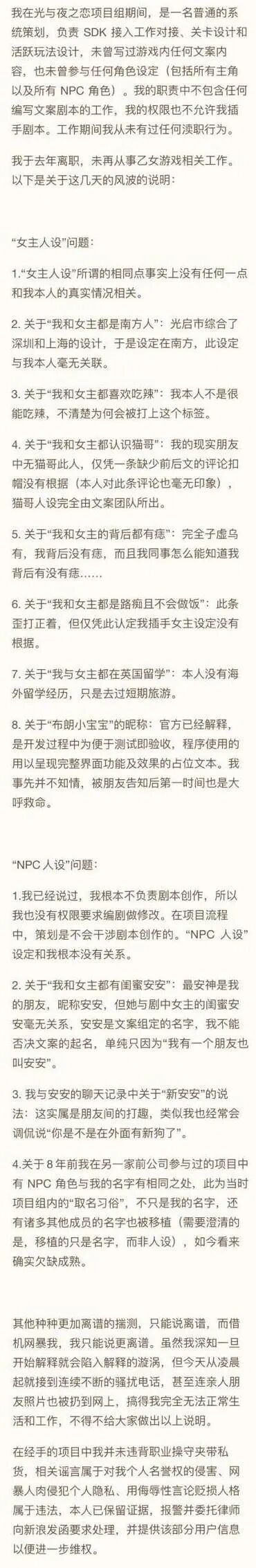 6月6日凌晨,布朗云在微博回应称其仅仅为《光与夜之恋》的系统策划而非文案策划,并且在相关事件发生前已经离职。