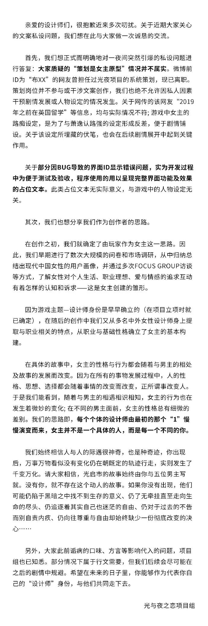 回应称,《光与夜之恋》女主人设是项目组通过多次问卷调查和市场调研,归纳总结出的中国现代女性用户画像。而设置员工在职期间的工作职责为活动、关卡设计、平台能力接入、素材对接等工作,无法接触也没有能力更改游戏文案。