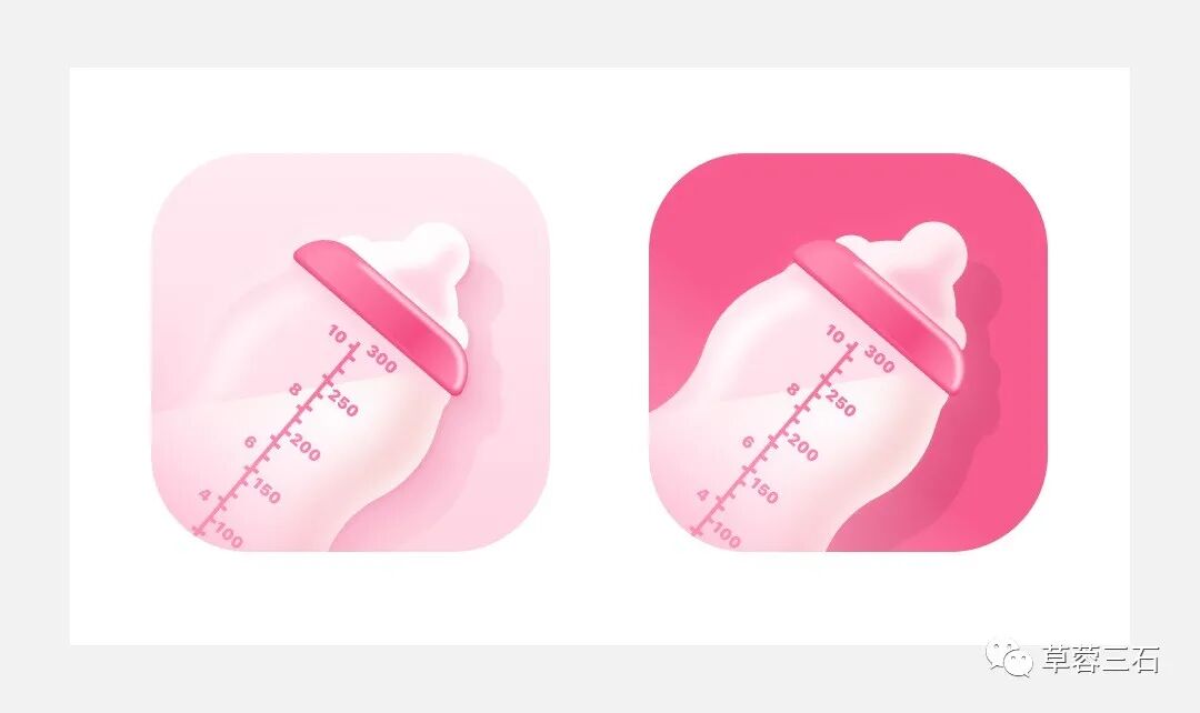 因为背景色浅加上瓶子本身也是透明的,图标缩小或者离远看无法辨识。这时候给背景色换成饱和度高的红色,瞬间就衬托出奶瓶形象了。