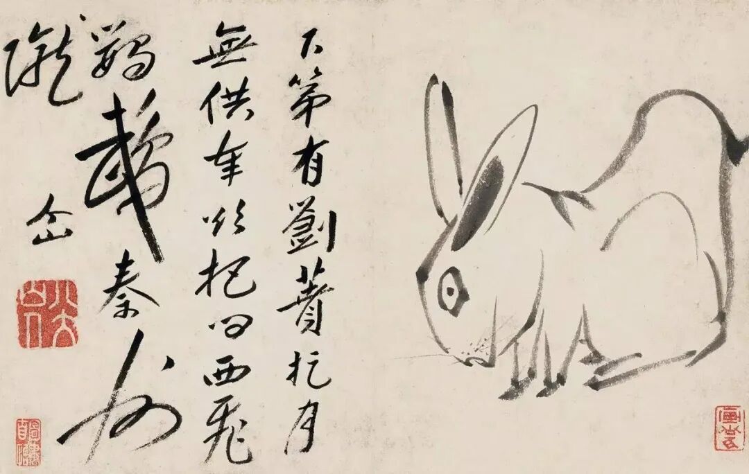 这是我们目前所知八大山人唯一的一件以兔子为题材的画作,造型非常夸张。就是因为太夸张了,有点似是而非,有人还根据画上的题识内容猜想“画中的为什么不是鼠呢?而且不是一般的老鼠,而是大大的硕鼠!”