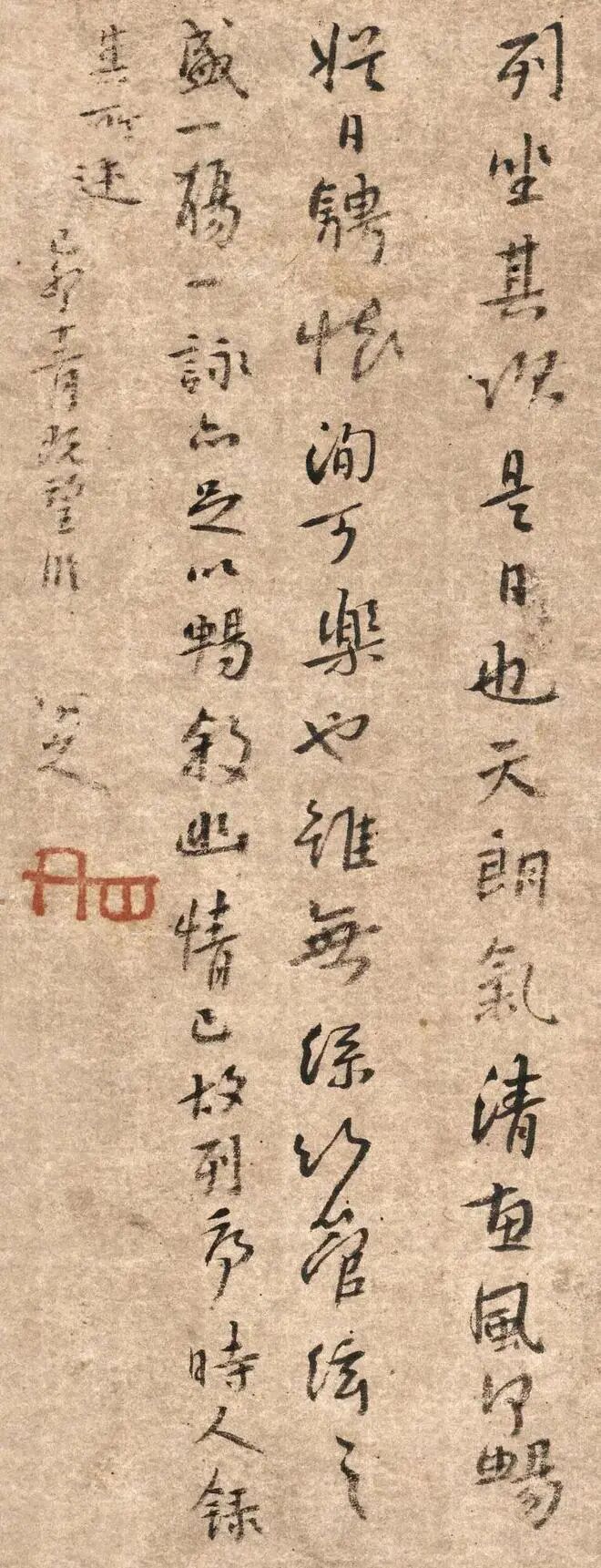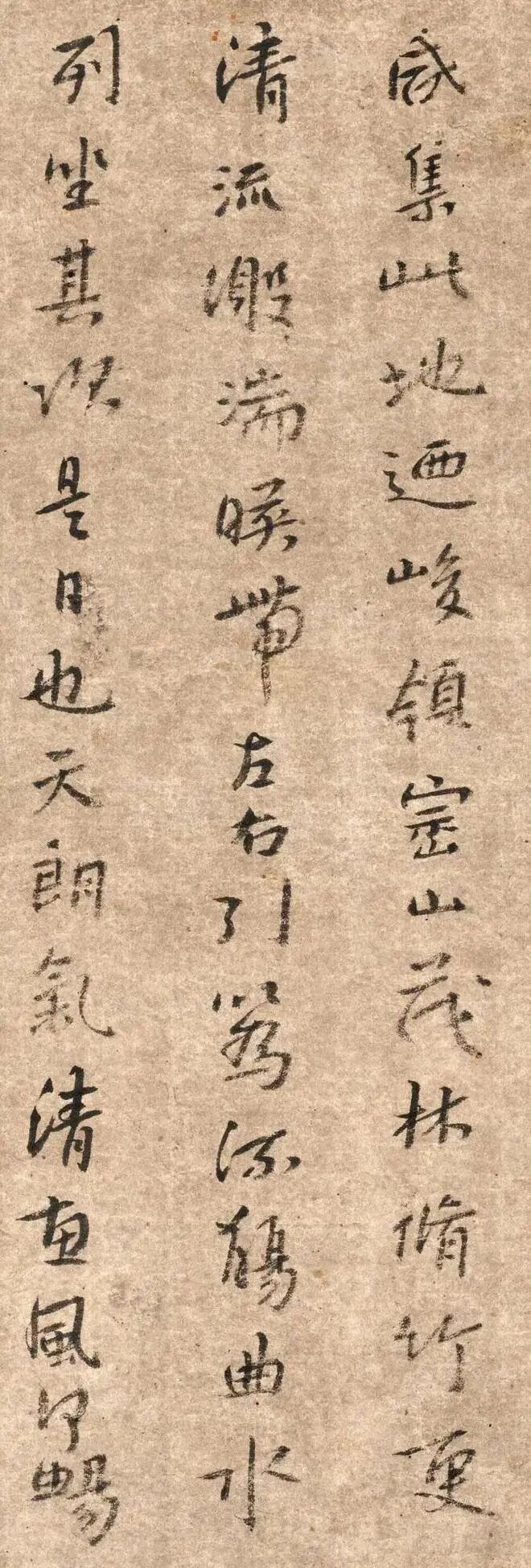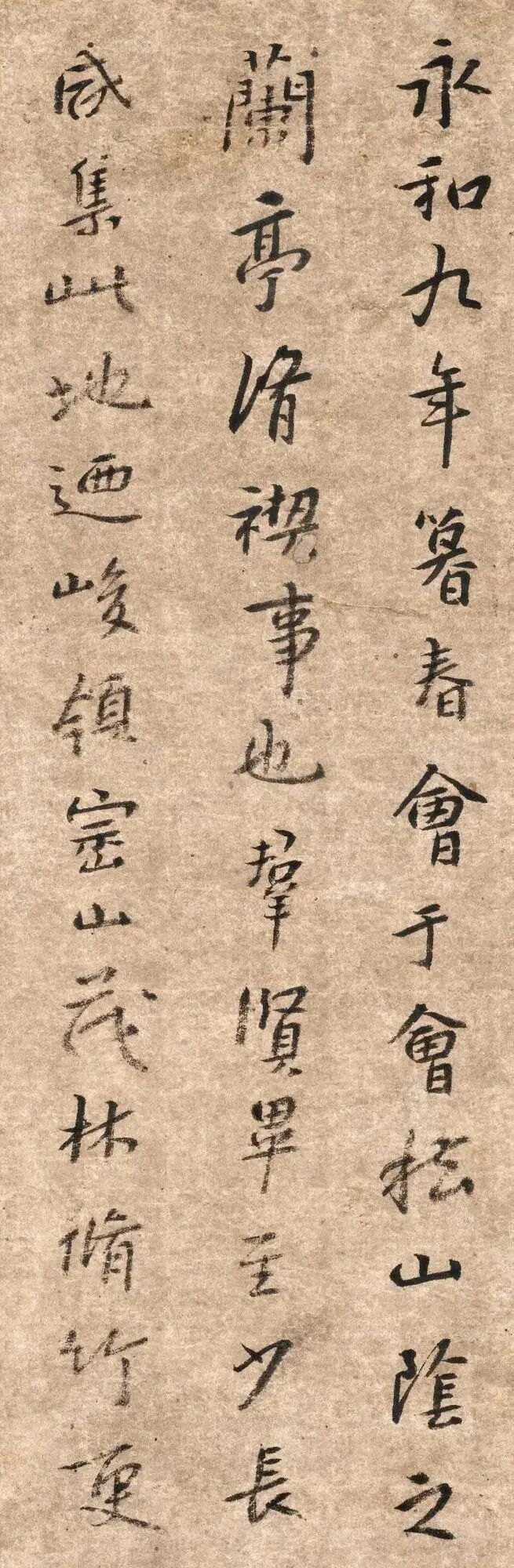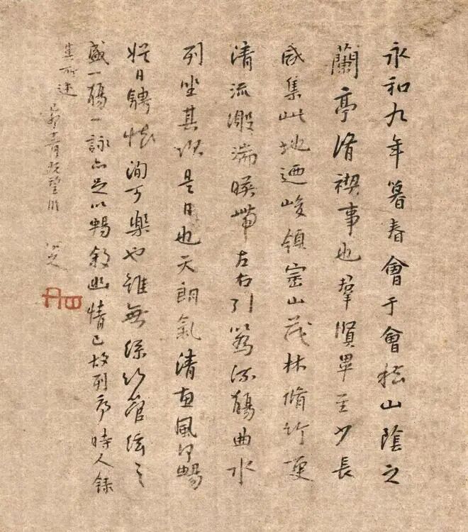 朱耷《临兰亭集序》,1699年作,此作品看形制当是册页中的一开。落款八大山人自己说是“己卯十二月既望临”,但是实际上不是临的,而是随手写“兰亭序”的内容,这样说是因为这幅作品内容与“兰亭序”的内容并不一致。“永和九年岁在癸丑暮春之初”,他写的是“永和九年暮春”,“此地有崇山峻岭”他写的是“此地乃峻岭崇山”,“崇”字则更是别出心裁,“山”字本在“宗”字上,却被他反过来写。“更有清流激湍”则脱“有”字,“惠风和畅”写的是“惠风何畅”,“信可乐也”则是“洵可乐也”。可见并非抄录或临写,而是凭借印象写他自己的字。
