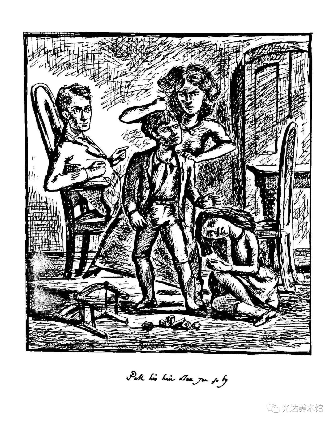 例如,把小说第八章希斯克利夫问凯瑟琳(爱称凯西)“那你为什么要穿这件绸裙子?”的情节改画成《凯西的梳妆》,把第六章“因为凯西把自己学的东西教给他”的插图改画成《孩子们》——此作被毕加索买去,如今则成为巴黎毕加索馆藏品。