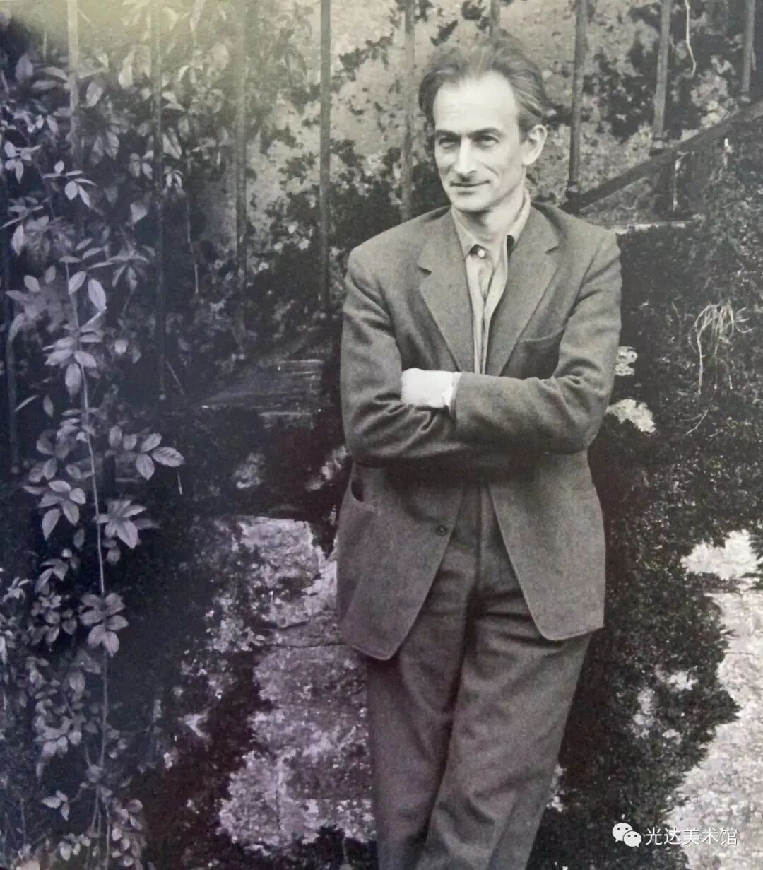 他在朴素简陋的画室里,站在窗前,一动不动,浑如一尊雕像。那扇窗,洋溢着融融的光,却不见外面的景色。他想必是看见的。他见到了什么?或许,他视而不见,思绪飘落到景色以外的地方?……我们无法知道,但却被这沉默的背影吸引,随着他的思绪越出画室,透过画面,趋向一个遥深博大的莫名境界。他在《画家与模特儿》(1980年至1981年)中,又一次向观众背过脸去,把背影留给我们。这个背影,我们并不陌生:早在1937年的《山》中,它就出现在右端远处的山坡上;在1951年至1954年的《圣安得烈商业巷》里,它再度沉浸在孤独的氛围中,虽然手里多了一条棍面包。