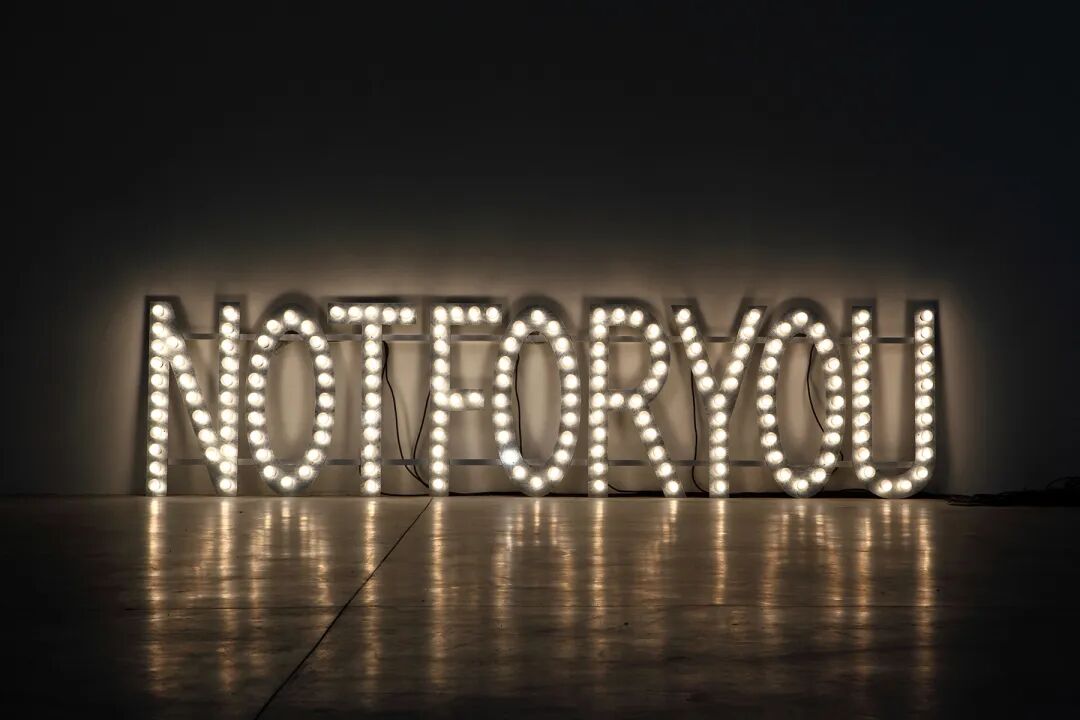 展览中的一些作品展示了我们被广告训练和操纵的程度,例如莫妮卡·邦维奇尼(Monica Bonvicini)的霓虹灯广告“NOT FOR YOU”(2006年)。